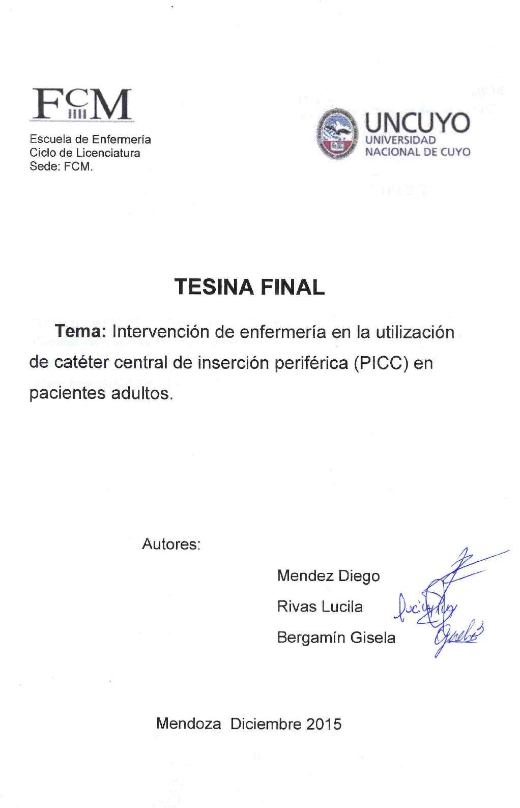 El objetivo principal de este estudio es determinar el nivel de conocimiento de los profesionales de enfermería del Hospital A. J. Scaravelli de Tunuyán, Mendoza sobre la utilización de catéter central de inserción periférica (PICC) (técnicas, procedimientos y complicaciones) en pacientes adultos, en el segundo trimestre de 2015. Es un estudio de diseño de tipo cuantitativo, exploratorio, de corte transversal. De un total de 50 enfermeros se tomó una muestra de 35 de ellos, a los que se realizó un cuestionario con 15 preguntas cerradas de múltiple opción y de carácter anónimo. La variables que se evaluaron fueron: datos personales (edad, sexo, estado civil, título habilitante, etc.) y conocimientos de PICC (participación, fármacos, complicaciones, utilización, entre otros).