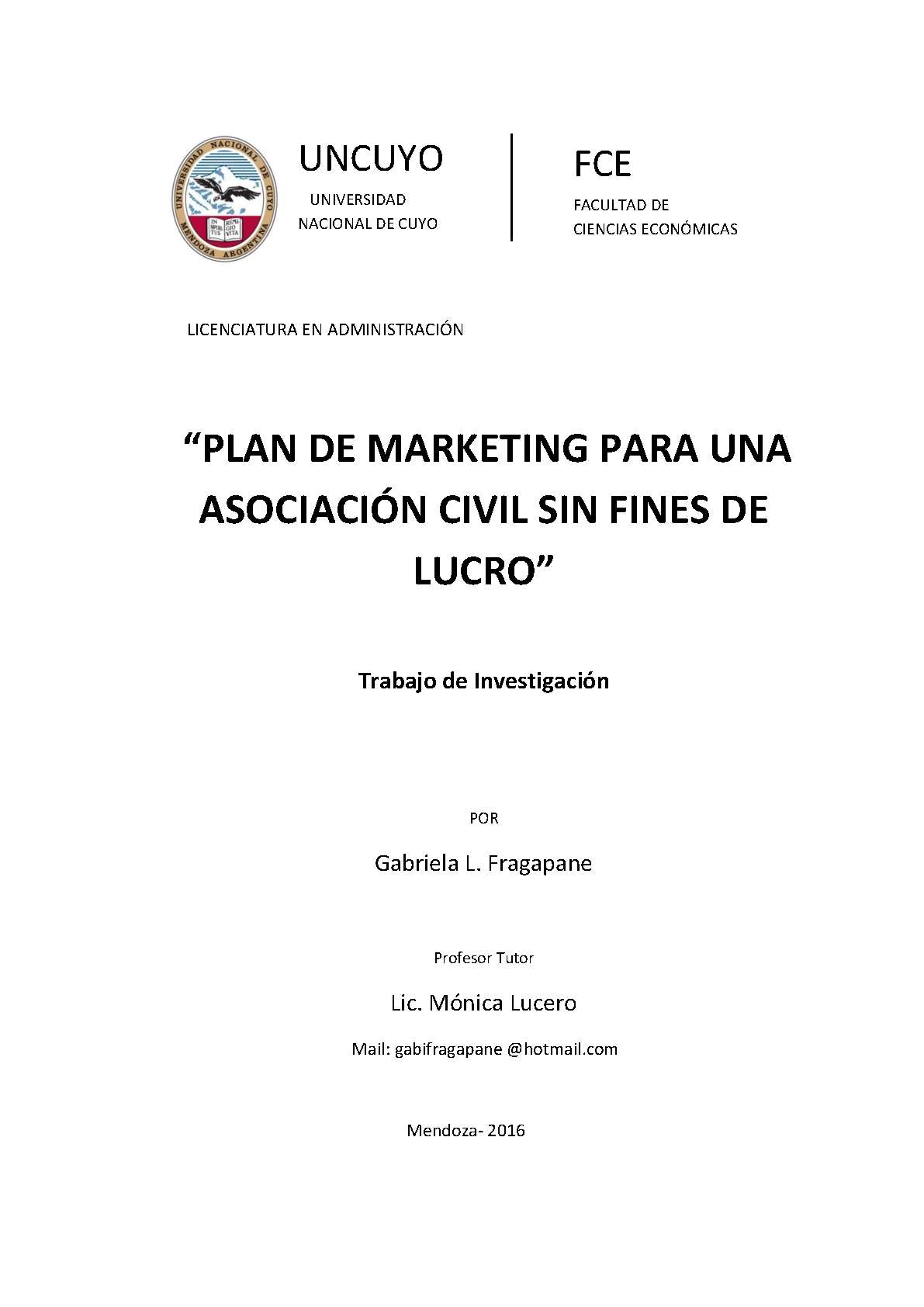 Fragapane, Gabriela. (2016). Plan de marketing para una asociación civil sin fines de lucro: (Trabajo final de grado). Mendoza, Universidad Nacional de Cuyo. Facultad de Ciencias Económicas.