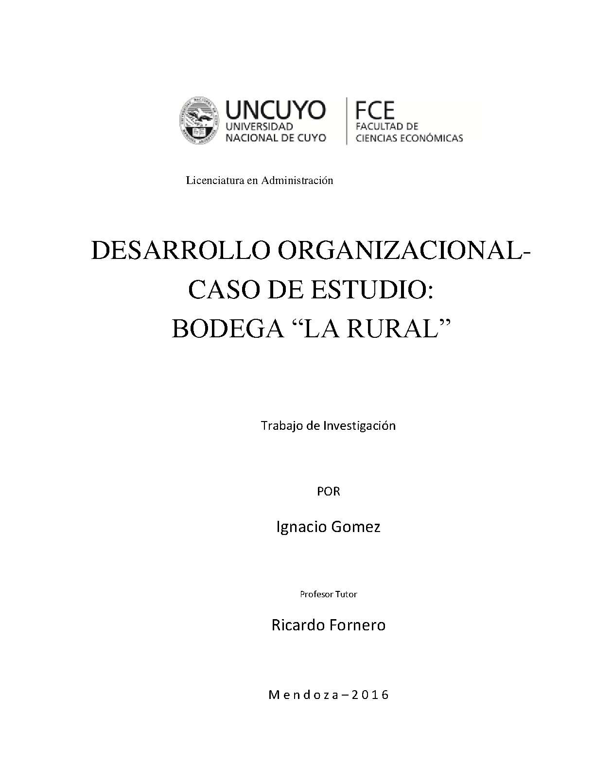 Se explica el concepto de desarrollo organizacional y se investiga la posibilidad de su aplicación a un caso específico: la bodega “La Rural", la cual busca incrementar sus ventas y así su participación en el mercado, en el segmento del champagne.