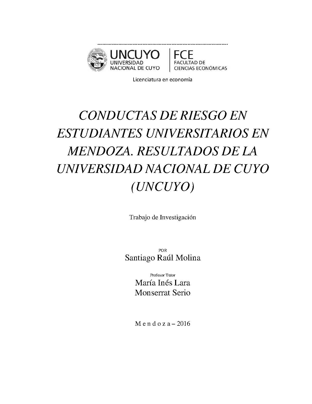 Molina, Santiago Raúl. (2016). Conductas de riesgo en estudiantes universitarios en Mendoza: resultados de la Universidad Nacional de Cuyo (UNCuyo) (Trabajo final de grado). Mendoza, Universidad Nacional de Cuyo. Facultad de Ciencias Económicas.