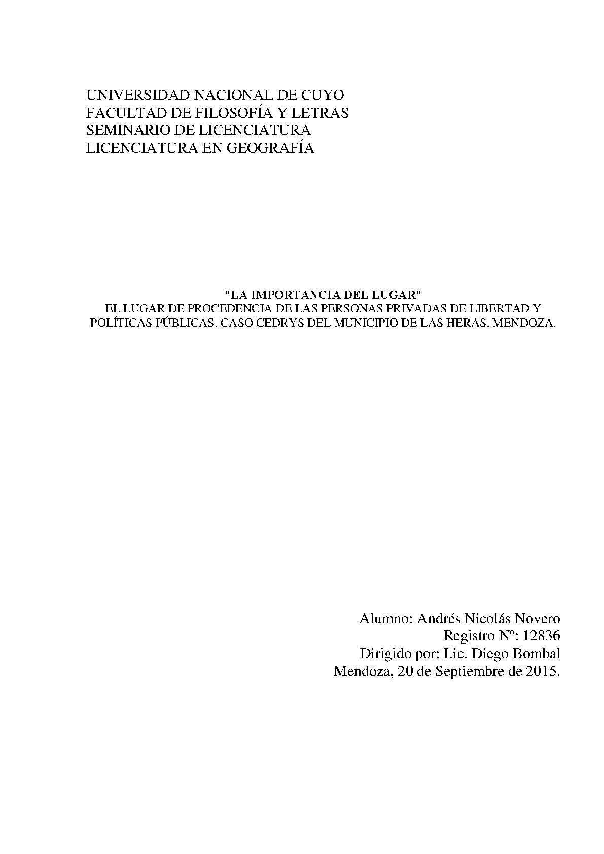 Novero, Andrés Nicolás. (2015). La importancia del lugar: el lugar de procedencia de las personas privadas de libertad y políticas públias : caso CEDRYS del municipio de Las Heras, Mendoza (Trabajo final de grado). Mendoza, Universidad Nacional de Cuyo. Facultad de Filosofía y Letras. Departamento de Geografía.