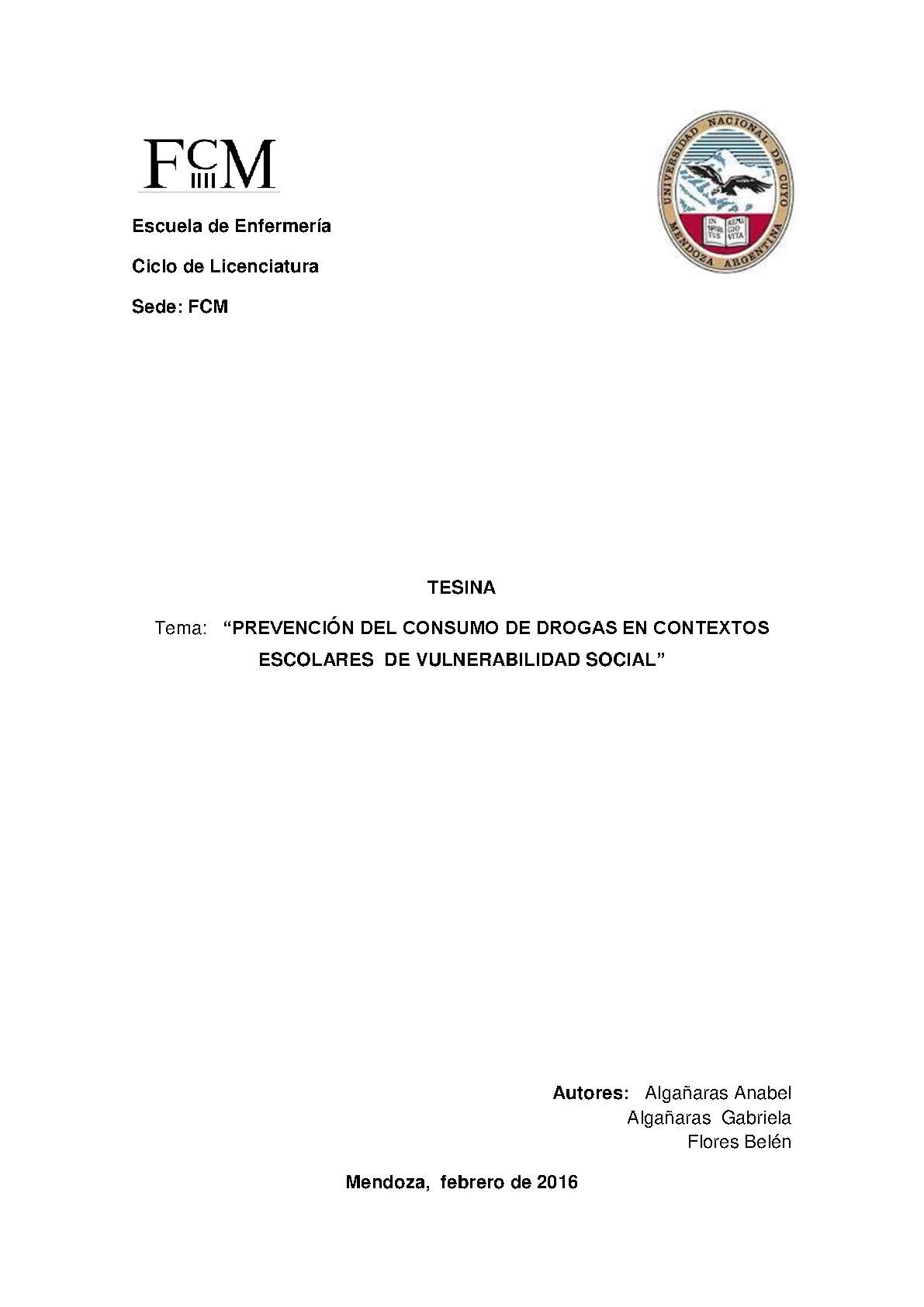 Algañaras, Anabel; Algañaras, Gabriela; Flores, Belén. (2016). Prevención del consumo de drogas en contextos escolares de vulnerabilidad social: (Tesina de grado). Mendoza, Universidad Nacional de Cuyo. Facultad de Ciencias Médicas. Escuela de Enfermería..
