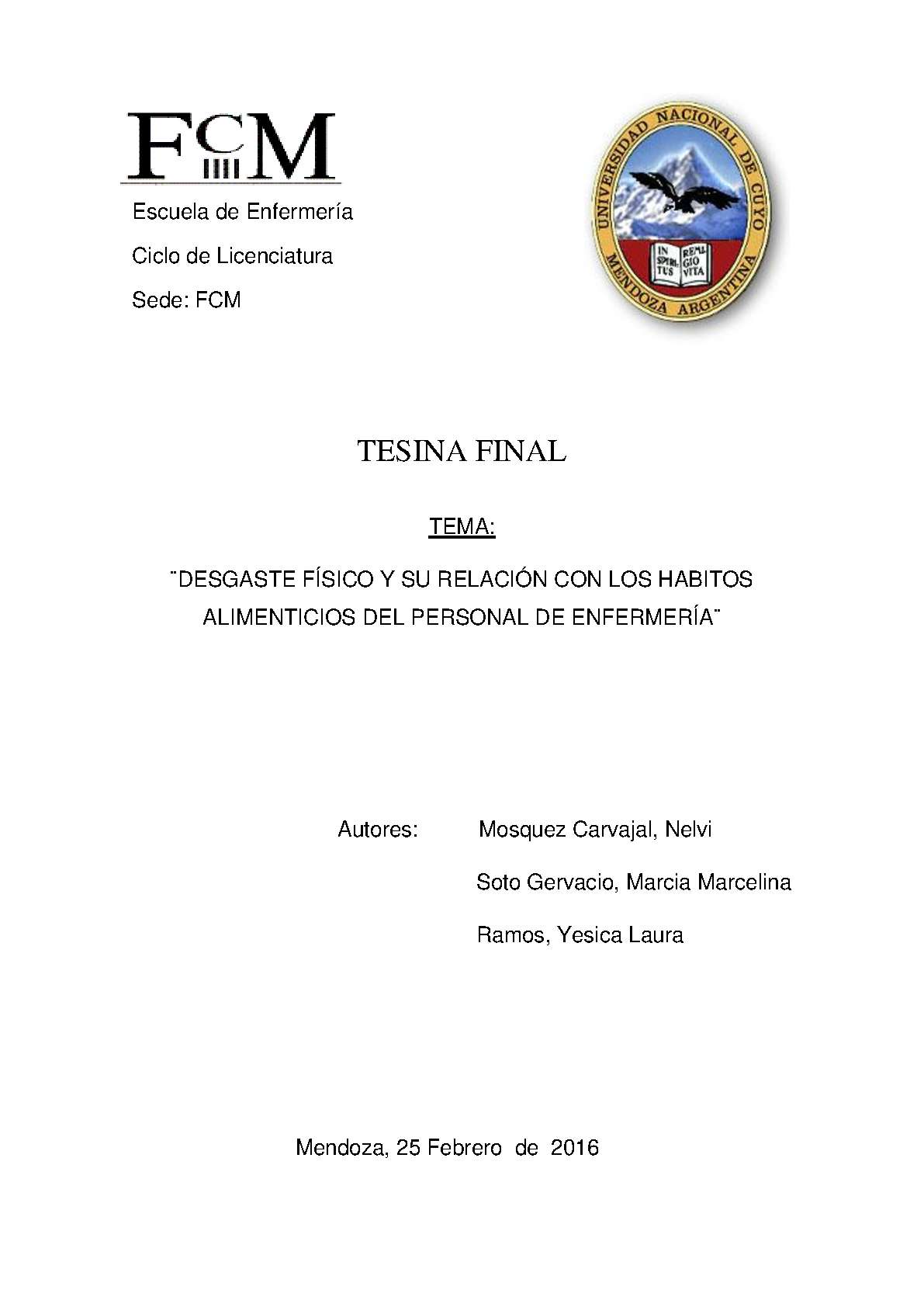 El siguiente trabajo de investigación tiene como objetivo conocer la relación que existe entre el desgaste físico (cansancio y agotamiento) del personal de enfermería que trabaja en la Clínica Santa María y el hábito alimenticio que mantienen los mismos. Es un estudio con enfoque cuantitativo, descriptivo y transversal, que se llevó a cabo en Mendoza, durante el primer semestre de 2015. La población y la muestra la constituyen un total de 120 enfermeras que prestan cuidados en diferentes servicios de dicha clínica a las que se les realizó una encuesta estructurada con preguntas cerradas. Las variables que se evaluaron fueron: Características personales (edad,sexo,nivel de formación, etc.), hábitos alimenticios (cantidad de comidas, tipos y calidad de los alimentos, etc.) y desgaste físico (turno laboral, nivel de cansancio, manifestaciones físicas y psíquicas, descanso, etc).
