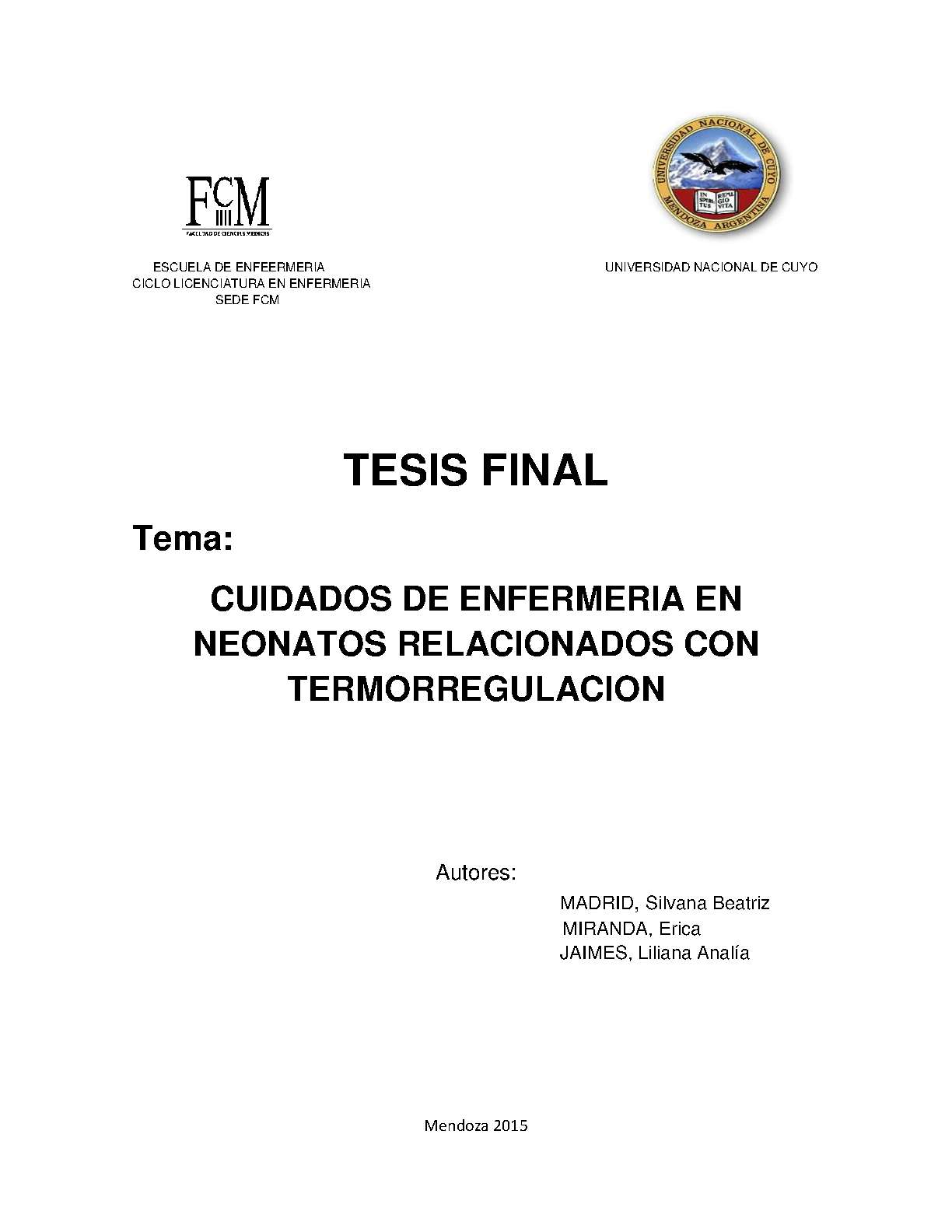La mantención de la temperatura normal en el prematuro permite reducir significativamente la morbimortalidad neonatal. El conocimiento por parte del personal que cumple funciones en el servicio de neonatología es fundamental para brindar un ambiente térmico adecuado al recién nacido. Por lo que el siguiente trabajo de investigación tiene como objetivo principal determinar cuál es nivel de conocimiento y capacitación de los enfermeros del Servicio de Neonatología del Hospital Luis Lagomaggiore sobre termorregulación de los recién nacidos a término y pre término y sobre el uso del soporte tecnológico (incubadoras, servo cunas, calentadores y humificadores) durante el primer semestre de 2015. Es un estudio de tipo cuantitativo, descriptivo, aplicable y de corte transversal. Del total de la población del personal que trabaja en dicho sector 70 enfermeros (licenciados, profesionales y auxiliares), se tomó una muestra de 20 de ellos, a los que se les realizó una encuesta.