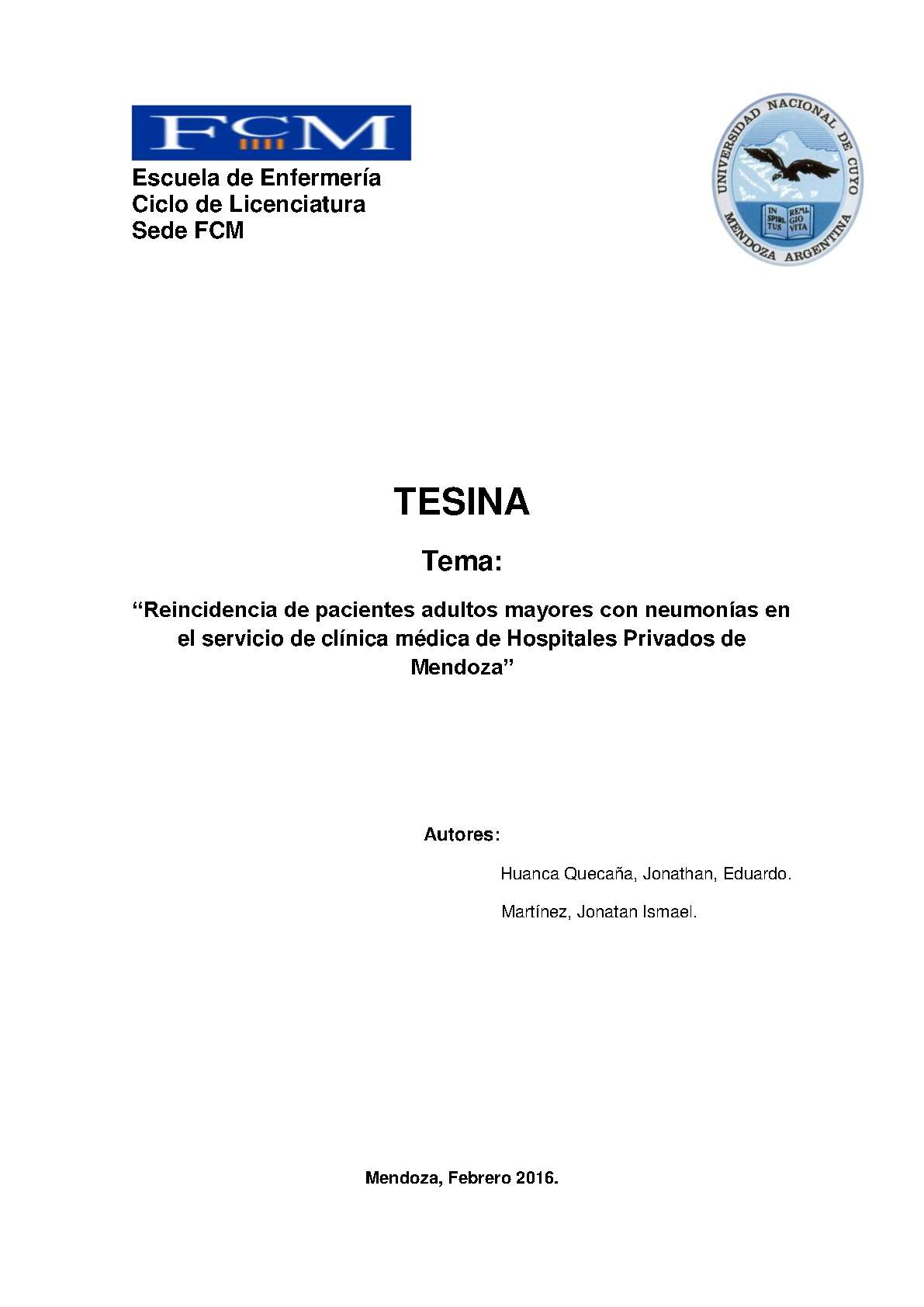 Huanca Quecaña, Jonathan Eduardo; Martínez, Jonatan Ismael. (2016). Reincidencia de pacientes adultos mayores con neumonías en el servicio de clínica médica de hospitales privados de Mendoza: (Tesina de grado). Mendoza, Universidad Nacional de Cuyo. Facultad de Ciencias Médicas. Escuela de Enfermería..
