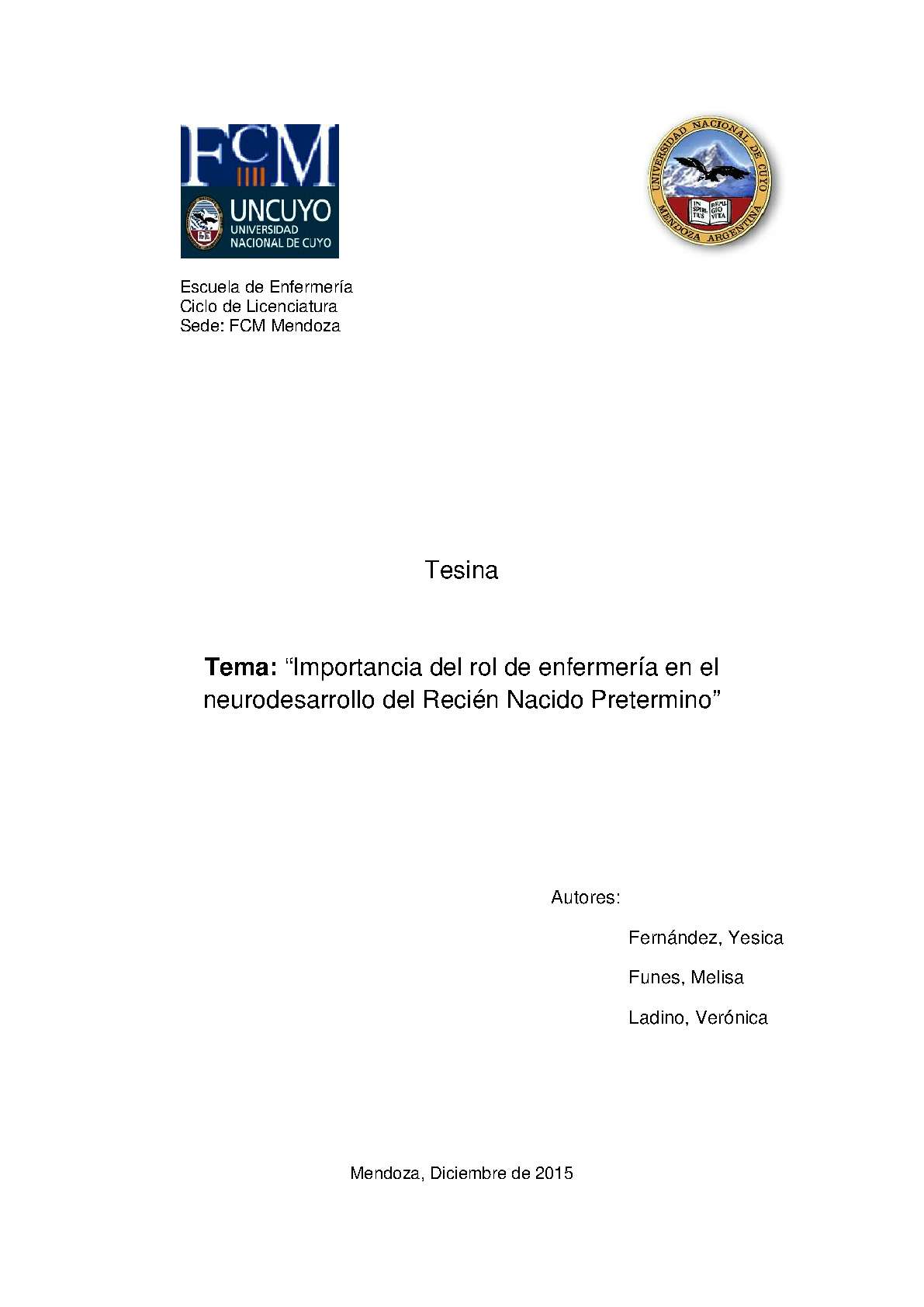 El cuidado del neurodesarrollo en el recién nacido prematuro es un desafío para todo el personal que trabaja en el Servicio de Neonatología. Cuidar el cerebro en desarrollo debería ser el principal objetivo de cada uno de los integrantes del equipo multidisciplinario. Es importante el rol que cumple enfermería para disminuir posibles secuelas que se pueden presentar en el recién nacido, brindando cuidados especiales (ruidos, iluminación, posturas). El presente trabajo tiene como objetivo determinar cuál es el grado de conocimiento que posee el personal de enfermería y el rol que cumple en el cuidado del neurodesarrollo del recién nacido pretérmino del Hospital Virgen de la Misericordia, Godoy Cruz, Mendoza, durante los meses de febrero hasta julio de 2015. Es un estudio de tipo cuantitativo, descriptivo, transversal correlacional-causal. Con un universo de 150 enfermeros y una muestra de 50 enfermeros del Servicio de Neonatología del mismo nosocomio.