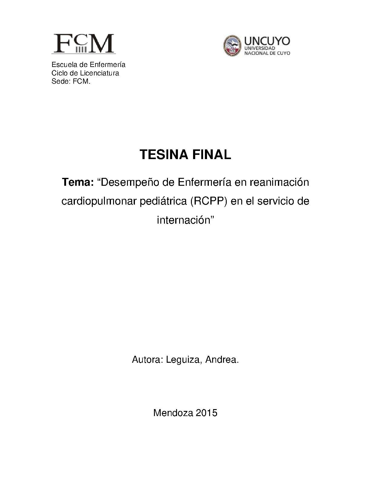 El paro cardiorrespiratorio (PCR) consiste en el cese de la actividad mecánica del corazón, y se diagnóstica ante la falta de conciencia, respiración y pulso. Las medidas aplicadas para revertirlo en su conjunto se denominan resucitación cardiopulmonar (RCP). El PCR en la población pediátrica es un evento prevenible, y los enfermeros/as, quienes están más frecuentemente en contacto con los pacientes internados, deben estar capacitados para identificar este suceso (diagnóstico) y prevenirlo. Esto incluye la adquisición de conocimientos teóricos y prácticos sobre las medidas más efectivas a realizar el RCP básico y avanzado en pediatría. Es por ello que el objetivo principal de esta investigación es determinar qué conocimientos y habilidades poseen los enfermeros del Servicio de Internación del Área Crítica Quirúrgica sobre Reanimación Cardiopulmonar en el Hospital Pediátrico Dr. H. Notti, Guaymallén, Mendoza, en 2015. Es una investigación de tipo cuantitativa, modalidad de campo, descriptiva y de corte transversal. El universo estuvo constituido por 30 enfermeros de dicho servicio y se tomó una muestra de 20 de a los que se les realizó una encuesta anónima, con respuestas múltiple opción.