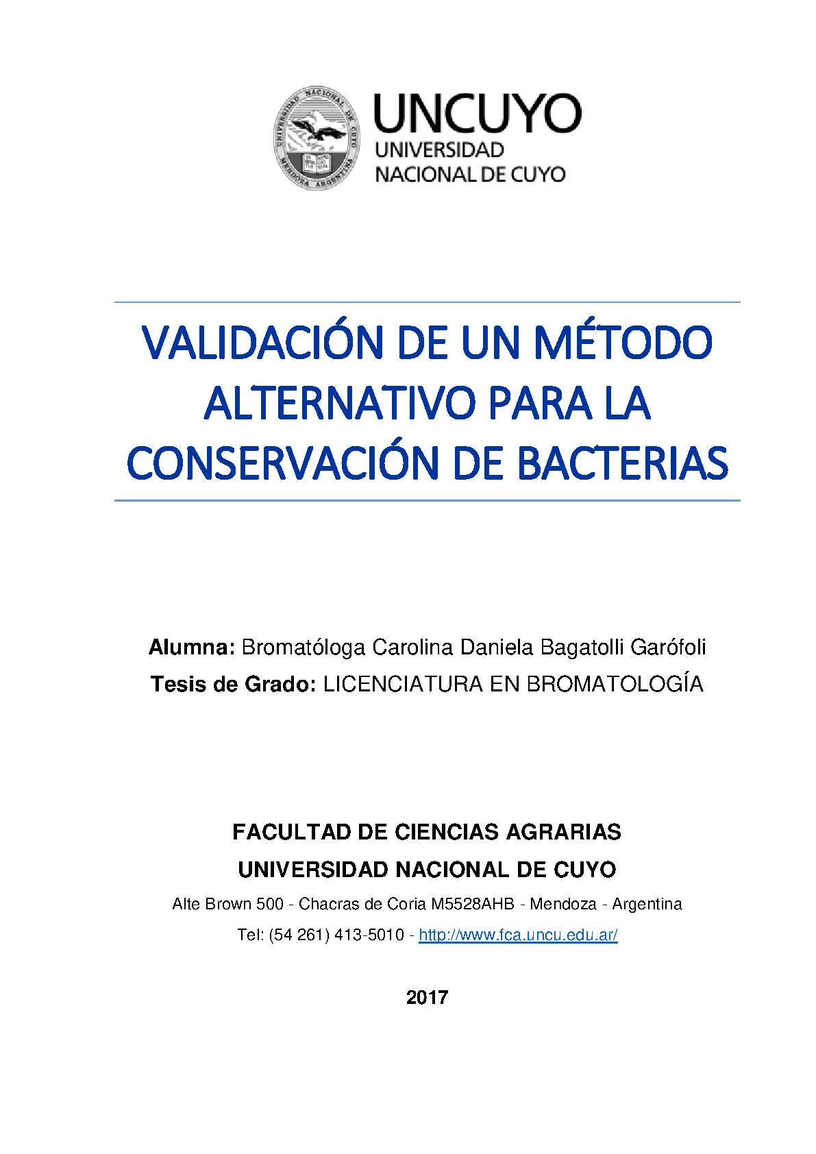 Bagatolli Garófoli, Carolina Daniela. (2017). Validación de un método alternativo para la conservación de bacterias: (Tesina de grado). Mendoza, Universidad Nacional de Cuyo. Facultad de Ciencias Agrarias .