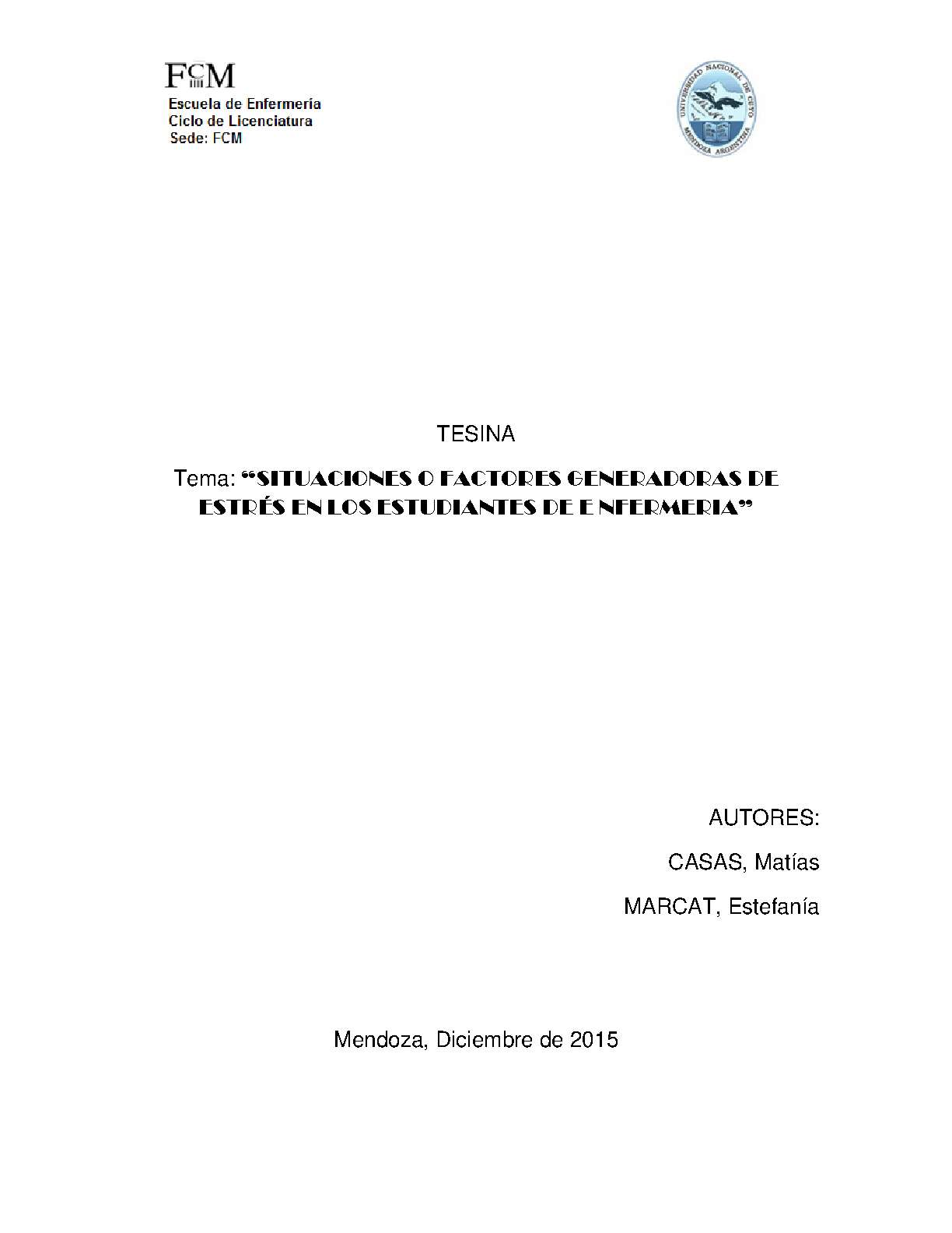 El estrés es, hoy en día, una problemática a la que se está prestando una atención creciente. Sin embargo, el estrés académico o estrés del estudiante no recibe la suficiente atención en el ámbito de la investigación. El estrés es la respuesta fisiológica, psicológica y de comportamiento, de un sujeto que busca adaptarse y reajustarse a presiones tanto internas como externas. Los alumnos, deben tener siempre presente que un estudiante capacitado, estará siempre alerta y será capaz de delimitar su accionar responsabilizándose de su actuar. El presente trabajo de investigación tiene como objetivo determinar cuáles son los factores estresantes a los que se enfrentan los alumnos de Instituto del Docencia, Investigación y Capacitación Laboral de la Sanidad (IDICSA) del 1° año de la carrera de enfermería durante su cursado y sus experiencias prácticas, en el Hospital I. Perrupato, San Martín, Mendoza, año 2015. Es un estudio con diseño de tipo cuantitativo, descriptivo y de corte transversal. Se tomó el 100% de la población, 60 alumnos de primer año de enfermería profesional.