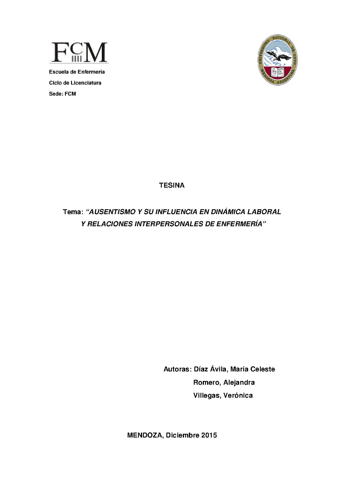 El ausentismo laboral es un problema universal que afecta de manera directa a todas las empresas independientemente de su tamaño y especialización. Por lo tanto el Área de Gestión Humana es clave en todas las organizaciones porque es responsable de velar por el bienestar de los empleados. El ausentismo influye profundamente en la organización de la atención, en lo que se refiere a costos, calidad de cuidado y el aumento de la presión ejercida en el personal, que trabajan en un entorno cada vez más insatisfactorio. Las consecuencias del ausentismo sea previsto o imprevisto, se hacen mucho más graves cuando hay escasez de personal calificado y las necesidades de salud de la población atendida sobrepasan la capacidad de los recursos humanos. Generalmente las condiciones de trabajo de los enfermeros se caracterizan por la sobrecarga de trabajo, jornadas extensas, turnos rotativos, trabajo nocturno, frecuentes cambios de servicios y recargos El objetivo principal de la siguiente investigación es determinar en qué medida la dinámica laboral y las relaciones interpersonales son afectadas por el ausentismo, en el personal de enfermería del Hospital Obstétrico Virgen de la Misericordia en Godoy Cruz, Mendoza, Octubre del 2015. Es una investigación de tipo cuantitativo, no experimental, aplicada, transversal, micro sociológica, descriptiva y de fuentes primarias. La muestra fue de 70 enfermeros de dicho hospital.