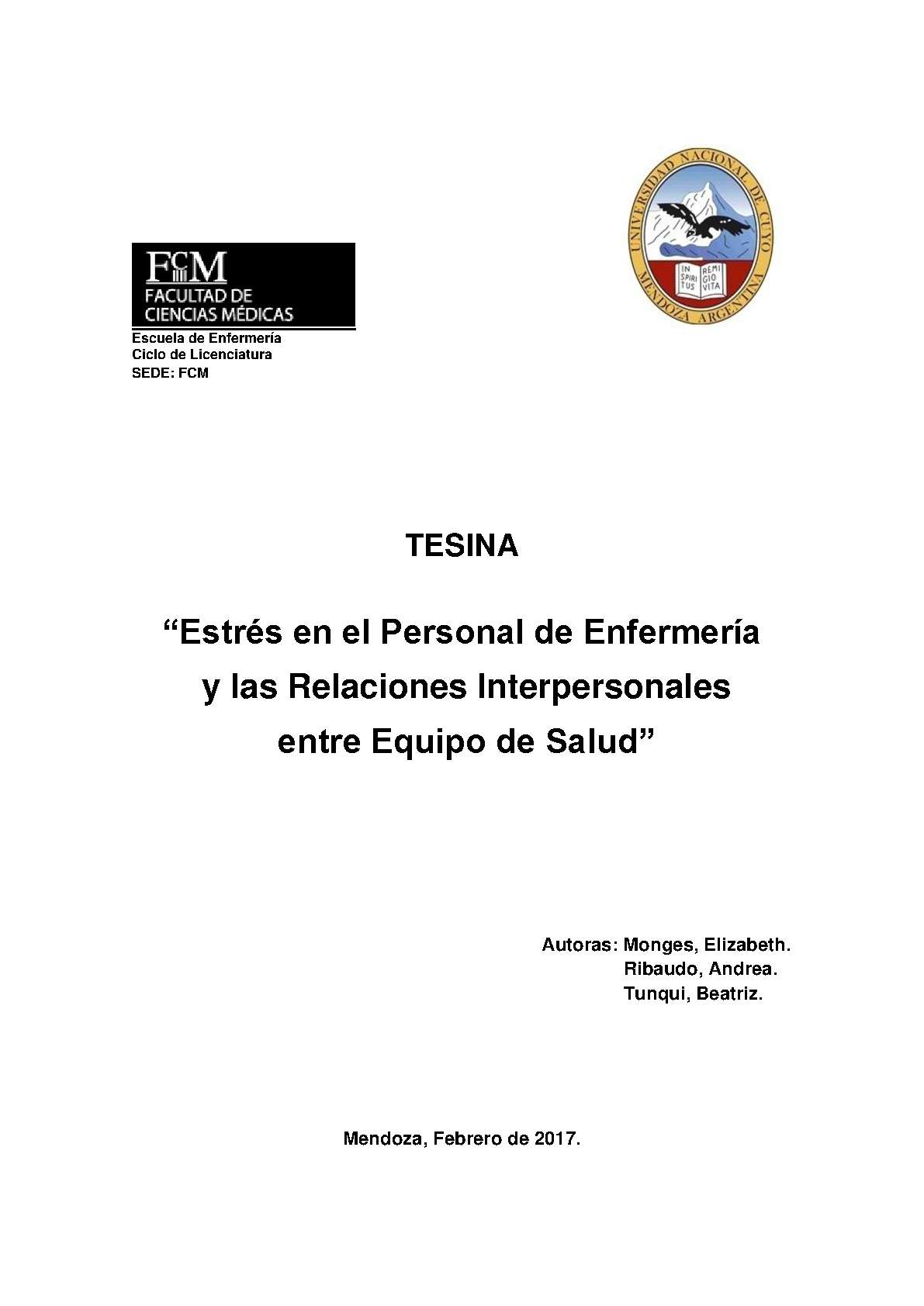 El enfermero(a), es un profesional preparado para valorar y tomar decisiones adecuadas en lo que, se refiere a la problemática de la salud, donde uno de los propósitos es evitar entorpecer la labor interdisciplinaria del personal que participa en la atención integral del paciente. Un gran porcentaje de enfermeros piensan que el resto del equipo de salud ignora su labor, la minimizan y no confían en sus aptitudes como profesionales además de no tener en cuenta sus opiniones. Estas situaciones generan un gran estrés en el personal de enfermería, sintiendo muchas veces la falta de motivación hacia su tarea y el deseo de superarse en el cuidado dirigido a los pacientes. Este trabajo de investigación tiene como objetivo conocer cuál es la relación que existe entre los signos de estrés en el personal de enfermería de los Servicios de Maternidad y las relaciones interpersonales del resto del equipo de salud, del Hospital Luis Lagomaggiore, Mendoza durante 2016. Se tomó como población y muestra al Equipo de Enfermeros de los Servicios de Admisión de Partos, Pre-Internación, Partos y Servicio de Maternidades de Internación Conjunta de dicho hospital: cincuenta (50) personas que respondieron un cuestionario con preguntas cerradas.