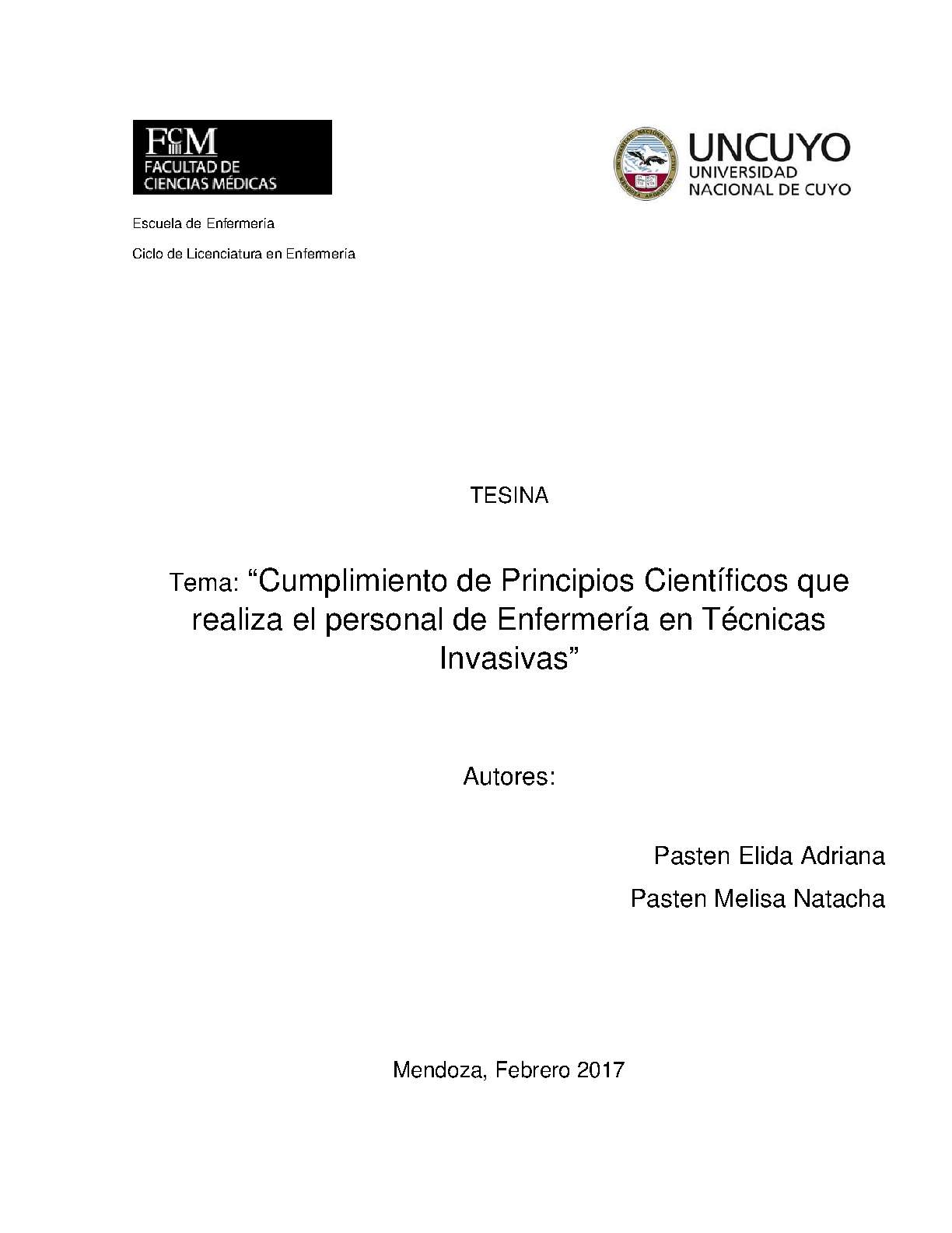 Pasten, Elida Adriana; Pasten, Melisa Natacha. (2017). Cumplimiento de principios científicos que realiza el personal de enfermería en técnicas invasivas: (Tesina de grado). Mendoza, Universidad Nacional de Cuyo. Facultad de Ciencias Médicas. Escuela de Enfermería..