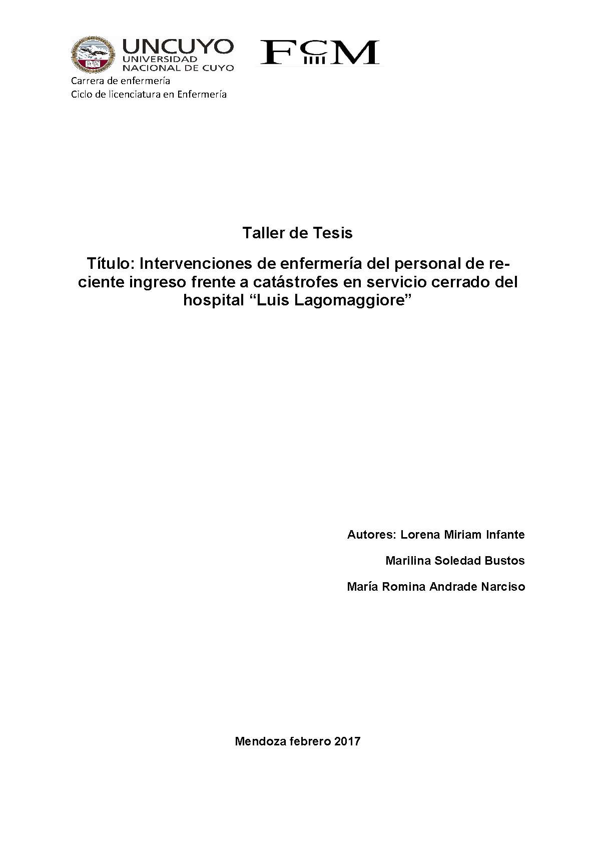 Intervenciones de enfermería del personal de reciente ingreso frente a catástrofes en servicio cerrado del hospital Luis Lagomaggiore
