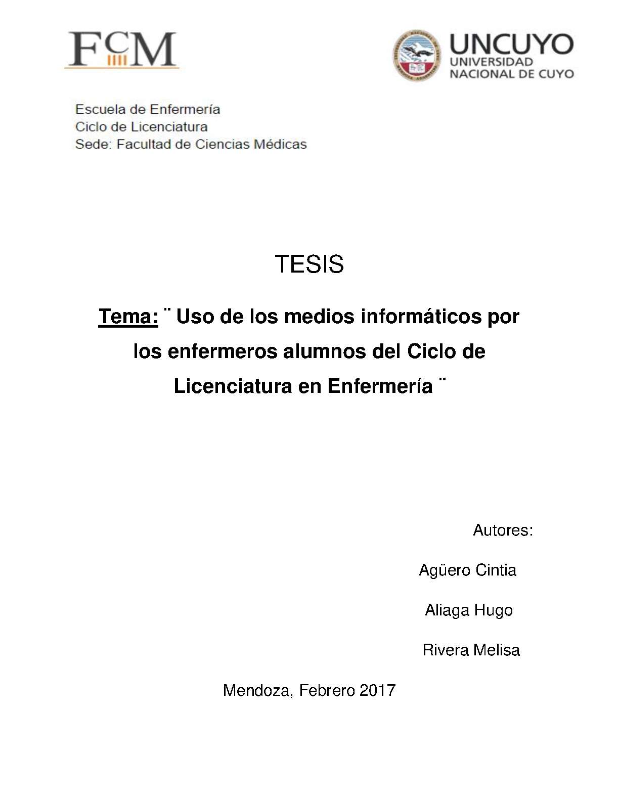 Agüero, Cintia; Aliaga, Hugo; Rivera, Melisa. (2017). Uso de los medios informáticos por los enfermeros alumnos del ciclo de Licenciatura en Enfermería: (Tesina de grado). Mendoza, Universidad Nacional de Cuyo. Facultad de Ciencias Médicas. Escuela de Enfermería..