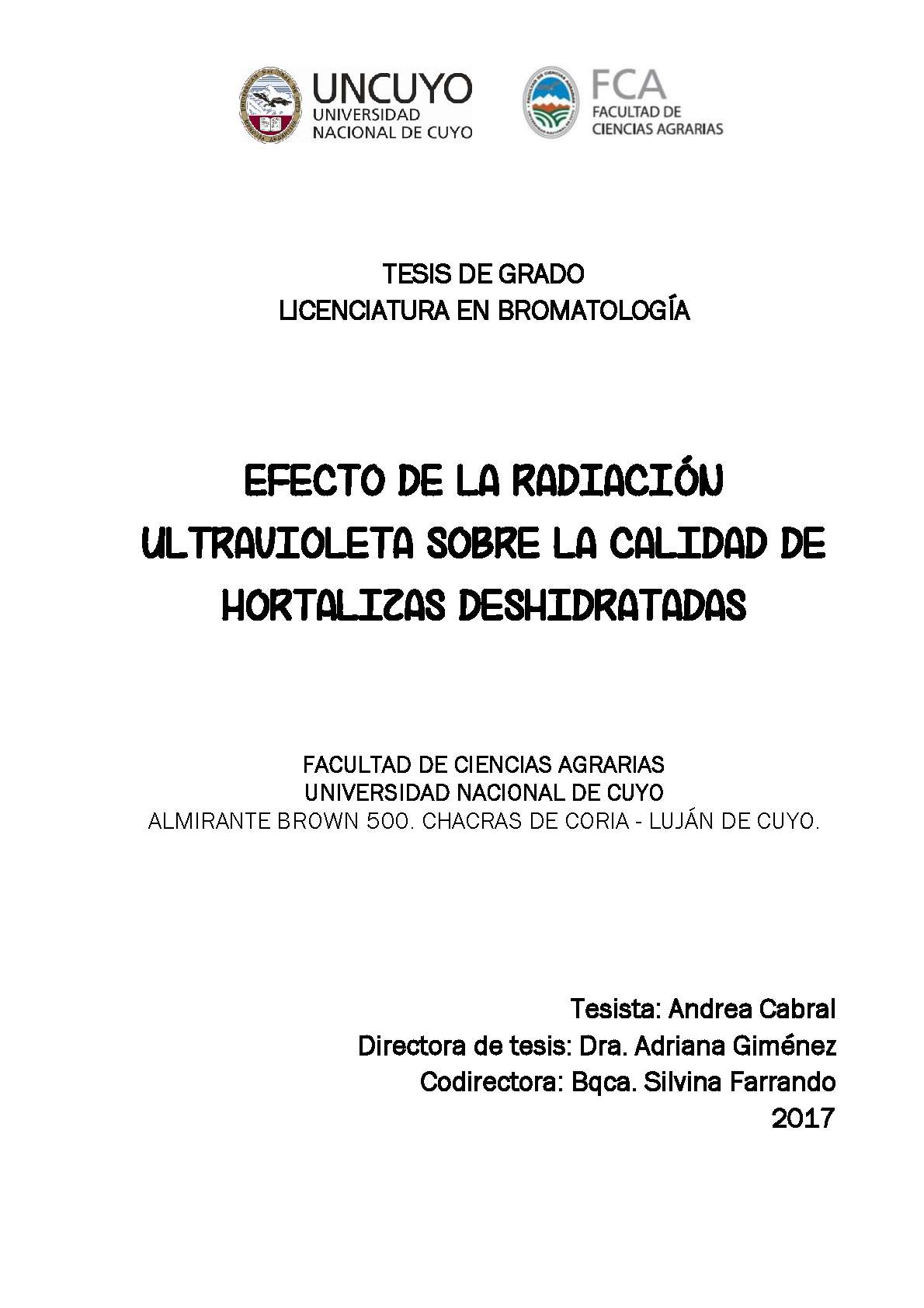 Cabral, Andrea. (2017). Efecto de la radiación ultravioleta sobre la calidad de hotalizas deshidratadas: (Tesina de grado). Mendoza, Universidad Nacional de Cuyo. Facultad de Ciencias Agrarias .