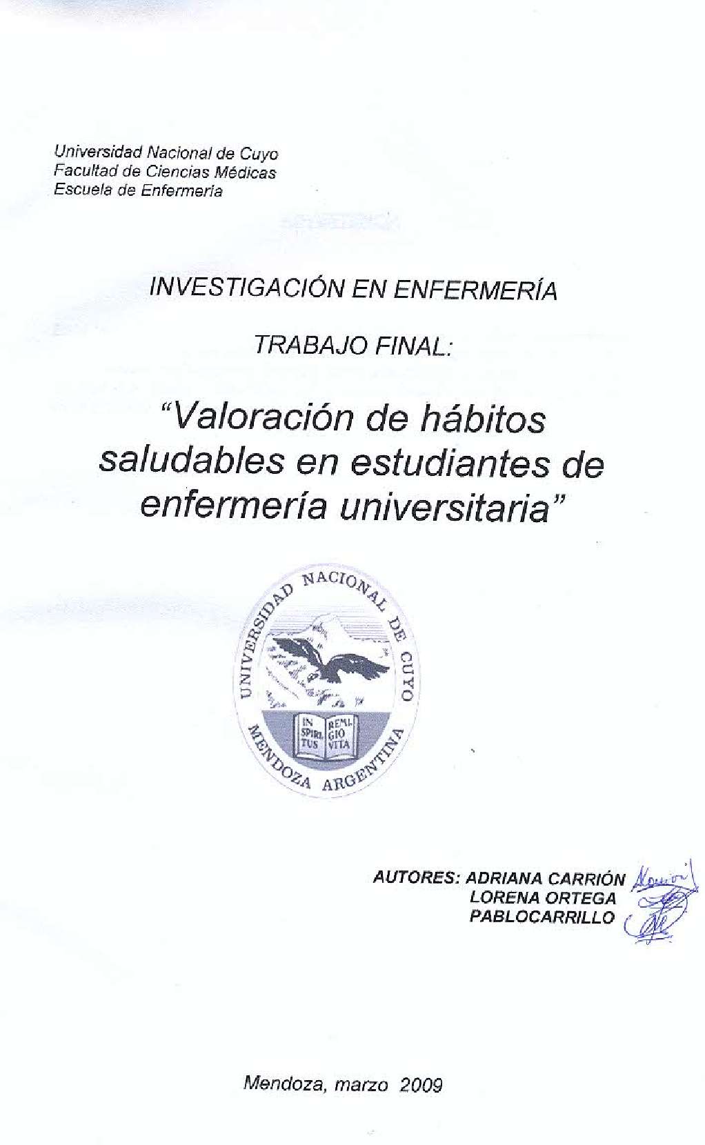 Carrión, Adriana; Ortega, Lorena; Carrillo, Pablo. (2009). Valoración de hábitos saludables en estudiantes de enfermería universitaria: (Tesina de grado). Mendoza, Universidad Nacional de Cuyo. Facultad de Ciencias Médicas. Escuela de Enfermería..
