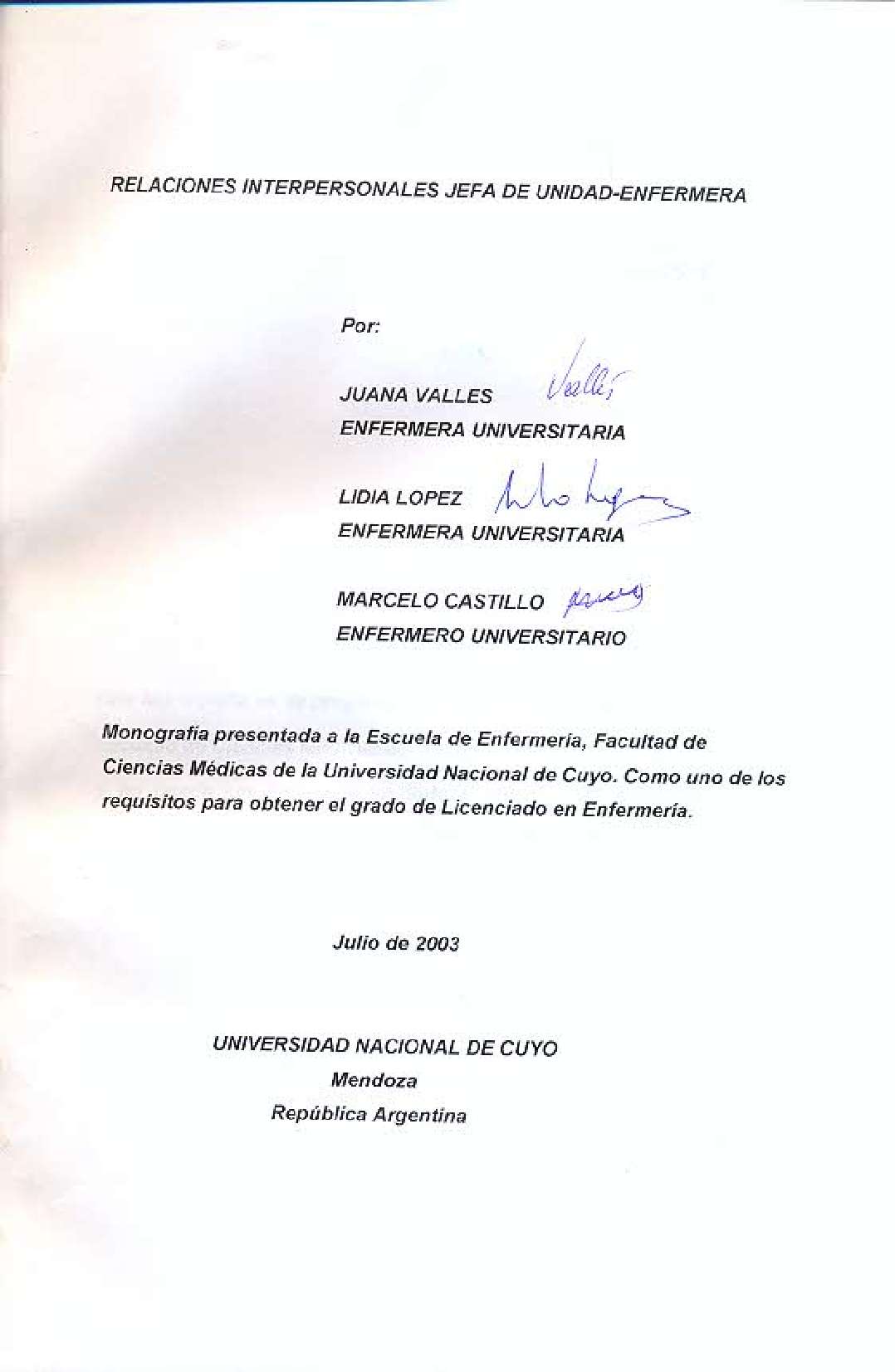 El profesional de enfermería en su labor diaria está en estrecha relación con sus superiores, con sus pares y con los pacientes. La relación con el otro es uno de los pilares del quehacer profesional, debido a la cantidad de horas que el enfermero pasa en la institución. Son múltiples los factores que afectan las relaciones interpersonales con sus pares y con sus superiores. Para que la comunicación en una institución sea real, es necesario que se tomen en cuenta las opiniones y demandas, además, que haya comprensión y cooperación entre los miembros del equipo de enfermería. Este trabajo de investigación tiene como objetivo conocer cuáles son los factores que inciden en la relación jefa de unidad y su personal a cargo que obstaculizan el adecuado funcionamiento de los servicios del Sector Público (Hospital Humberto Notti y Central) y privado (Clínica Colón) del Gran Mendoza en el periodo comprendido entre el 1 de enero al 31 de diciembre de 2002.