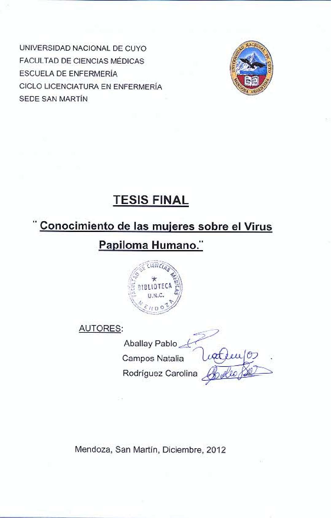 Aballay, Pablo; Campos, Natalia; Rodríguez, Carolina. (2012). Conocimiento de las mujeres sobre el Virus Papiloma Humano: (Tesina de grado). Mendoza, Universidad Nacional de Cuyo. Facultad de Ciencias Médicas. Escuela de Enfermería..