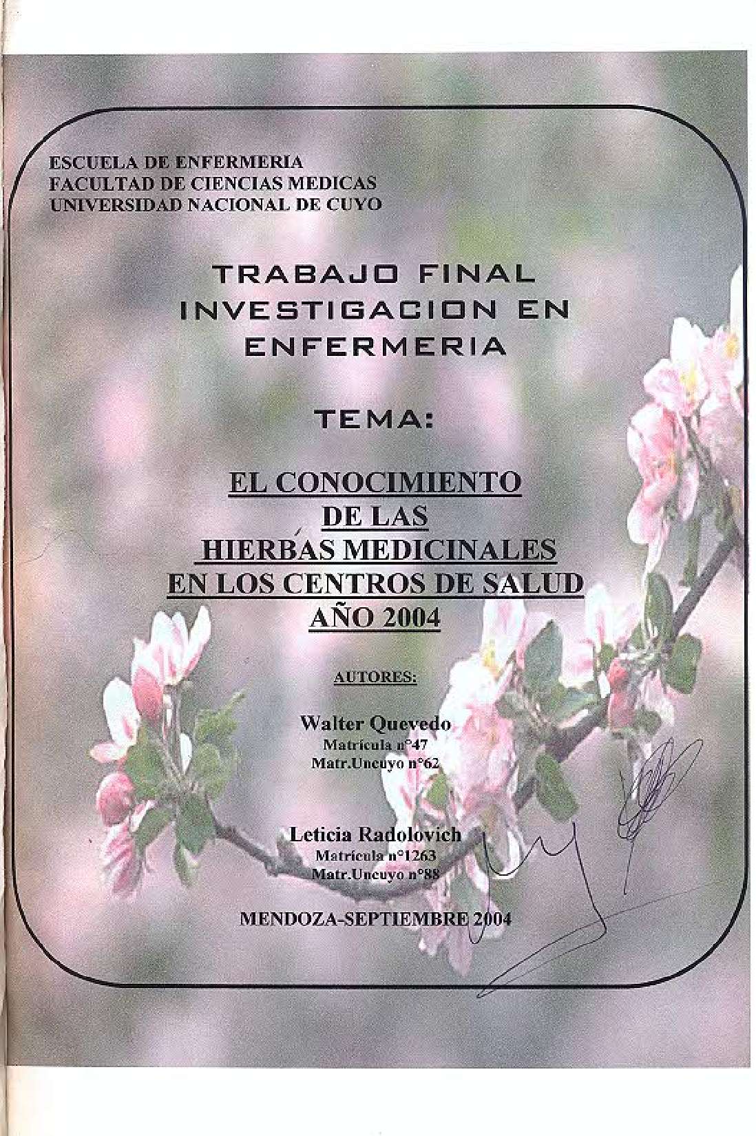 Las plantas han sido empleadas para aliviar los males de la humanidad desde tiempos inmemorables. El conocimiento empírico acerca de las plantas y sus efectos curativos se acumuló durante muchos milenios y posteriormente pasó a ser parte integral de sistemas y tradiciones de muchos lugares en el mundo (India, China, etc.). Aunque a partir del siglo pasado el empuje de la industria farmacéutica hizo que la terapéutica fundamentada en el empleo de plantas se viera como una práctica primitiva e irracional. En décadas recientes la fitoterapia ha experimentado un extraordinario resurgir. La cantidad de plantas con propiedades curativas es tan amplia que nadie puede dominar la totalidad del conocimiento en esta materia. Este trabajo de investigación tiene como objetivo determinar qué tipos de conocimientos tienen los enfermeros de los centros de salud del Gran Mendoza, 2004 sobre el uso de las hierbas medicinales y qué tipo de información brindan a sus pacientes.