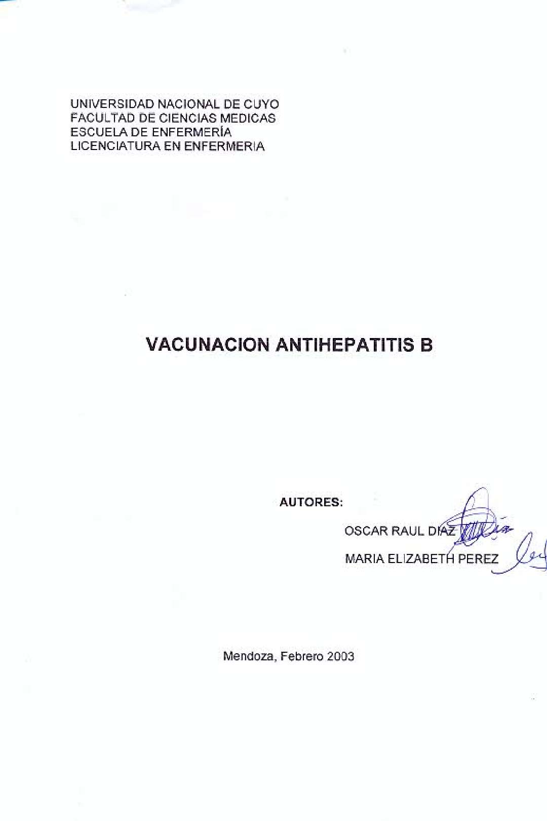 Díaz, Oscar Raúl; Pèrez, María Elizabeth. (2003). Vacunación antihepatitis B: (Tesina de grado). Mendoza, Universidad Nacional de Cuyo. Facultad de Ciencias Médicas. Escuela de Enfermería..