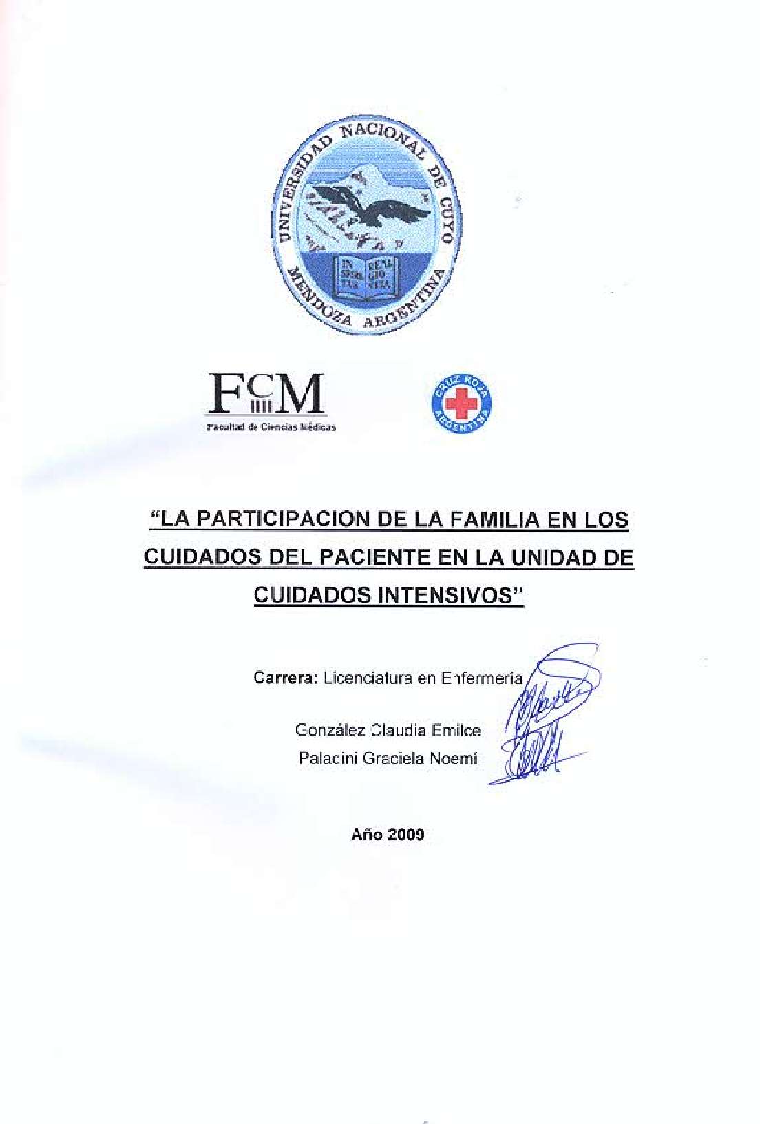 El ingreso a la unidad de cuidados intensivos provoca un estrés para el paciente y sus familiares, que se origina no solo de la gravedad del enfermo, sino también por las dificultades en la comunicación que existe entre ambos. En estos servicios los pacientes suelen estar solos en sus camas, separados por biombos de otros pacientes en las mismas condiciones, conectados a múltiples dispositivos de monitoreo y sueros, asistidos por médicos, enfermeros, técnicos, mucamas, pero alejados de sus familiares. El proceso del cuidado de pacientes en unidades de cuidados intensivos no solo depende del personal de salud sino también de la cooperación del propio paciente y la participación de los familiares. La familia es un recurso que tiene el enfermero, ya que es un apoyo psicológico, anímico y espiritual de su ser querido. Es importante capacitar a la familia para hacerlo participar en el cuidado del enfermo. Este trabajo de investigación tiene como objetivo valorar el grado de satisfacción y el nivel de participación que tiene la familia, durante la internación, en el cuidado de los pacientes ingresados en la Unidad de Cuidados Intensivos de la Asociación Mutual de Emprendimientos Generales, de San Rafael, Mendoza, en el periodo de diciembre de 2008 a febrero de 2009, y a su vez evaluar la relación que se establece entre el personal de enfermería y los familiares.