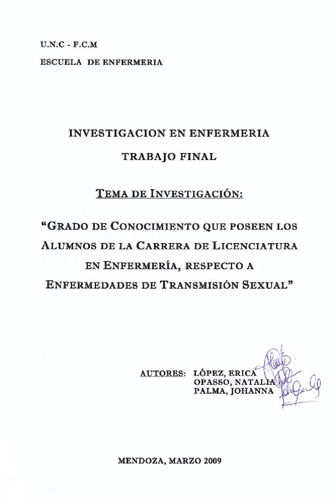 A lo largo del cursado de la carrera de Licenciatura en Enfermería, el tema de la sexualidad, educación sexual y enfermedades de trasmisión sexual (ETS) se desarrolló de manera muy básica o incompleta. En si, los temas referidos a la problemática, se incluyeron en la currícula de la carrera, pero tal vez no con la cantidad de material informativo u horas necesarias para adquirir el conocimiento suficiente para afrontar luego las inquietudes de las personas que concurren a diario a los distintos centros de salud, a realizar consultas sobre prevención o bien para seguir un tratamiento luego de haber sido afectadas por algunas de estas ETS. El personal de enfermería es quien tiene contacto directo con el paciente y debe estar capacitado ante las consultas de los mismos. Se debe destacar el aumento de las ETS, generalmente en adolescentes, debido a que estos se inician en la vida sexual a una corta edad, por falta de comunicación en las familias, por la mala interpretación de los mensajes que brindan los medios de comunicación, por la no concurrencia al sistema de salud, o por la falta de información brindada por los profesionales de la salud en los centros asistenciales. El objetivo de este trabajo de investigación es identificar el nivel de conocimientos que poseen los estudiantes de 4to año de la Licenciatura en enfermería de la UNCuyo sobre ETS, analizar la preparación que cada alumno presenta sobre el tema, los conocimientos recibidos en su formación académica y si están en condiciones de brindar información oportuna y adecuada a la población. Es estudio se realizó en Mendoza en 2008.