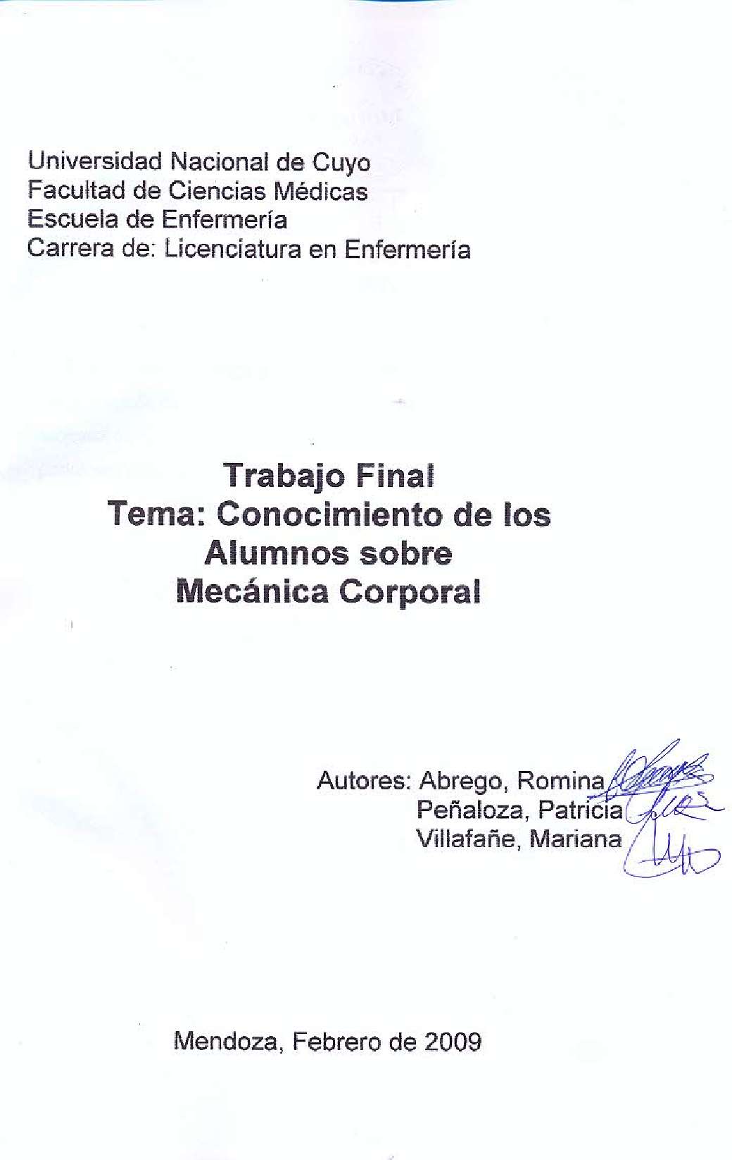 Abrego, Romina; Peñaloza, Patricia; Villafañe, Mariana. (2009). Conocimiento de los alumnos sobre mecánica corporal: (Tesina de grado). Mendoza, Universidad Nacional de Cuyo. Facultad de Ciencias Médicas. Escuela de Enfermería..