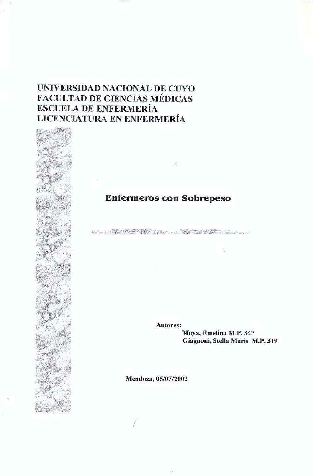 Moya, Emelina; Giagnoni, Stella Maris. (2002). Enfermeros con sobrepeso: (Tesina de grado). Mendoza, Universidad Nacional de Cuyo. Facultad de Ciencias Médicas. Escuela de Enfermería..