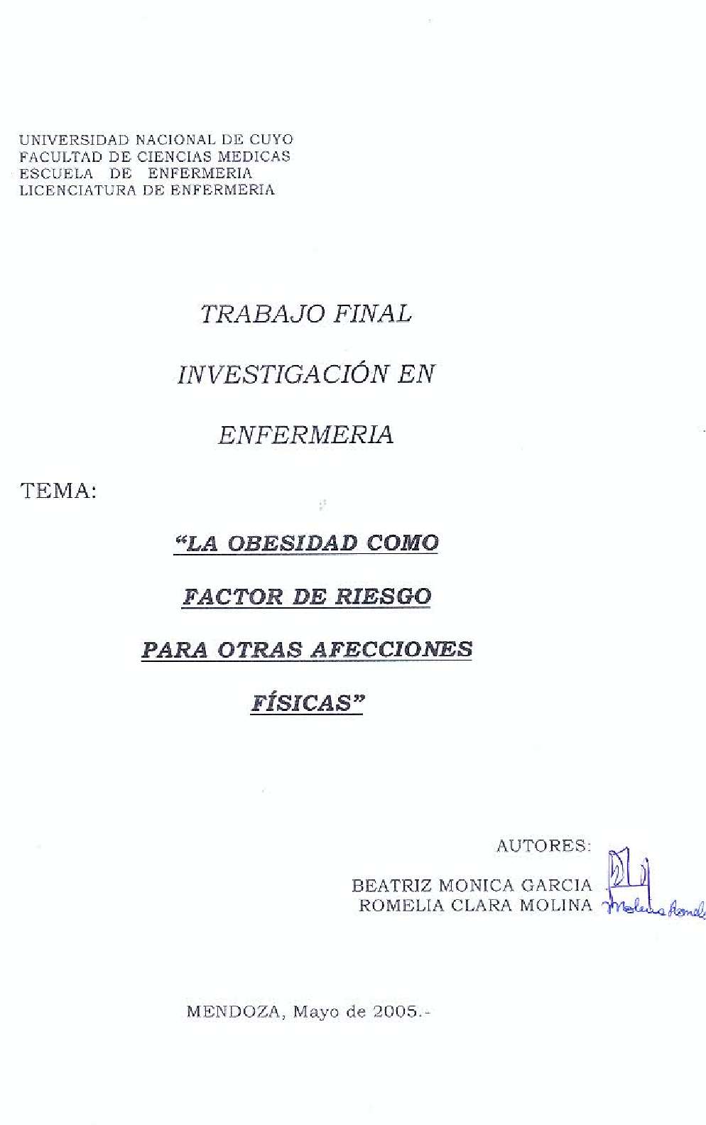 Hoy en día se habla de “epidemia de obesidad en el mundo". En la última década la incidencia de la obesidad ha aumentado en un tercio. Alrededor de 154 millones de personas en EEUU la padecen y aproximadamente 300.000 individuos mueren a causa de ella cada año en dicho país. En la Argentina, lamentablemente, no tenemos estadísticas precisas sobre el tema. Sí se dispone de un alto número de sondeos que estudian la prevalencia de la obesidad, en los cuales se ha llegado a establecer que, en nuestro país, el 62% de la población tiene sobrepeso. El sobrepeso y la obesidad afecta a todos los sectores de la población, pero en esta investigación se observa al personal de enfermería. Algunas de las consecuencias de estas patologías en el personal son: diabetes, hipertensión arterial, dislipidemias, trastornos respiratorios, osteoarticulares, algunos cánceres (mamas) entre otras. Este trabajo de investigación tiene como objetivo conocer cómo incide el problema de obesidad en el personal de enfermería del Hospital Carlos Pereyra de la ciudad de Mendoza, durante el año 2005, en la aparición de otras afecciones físicas y cómo afecta éste en la calidad de vida y en la calidad laboral del mismo.
