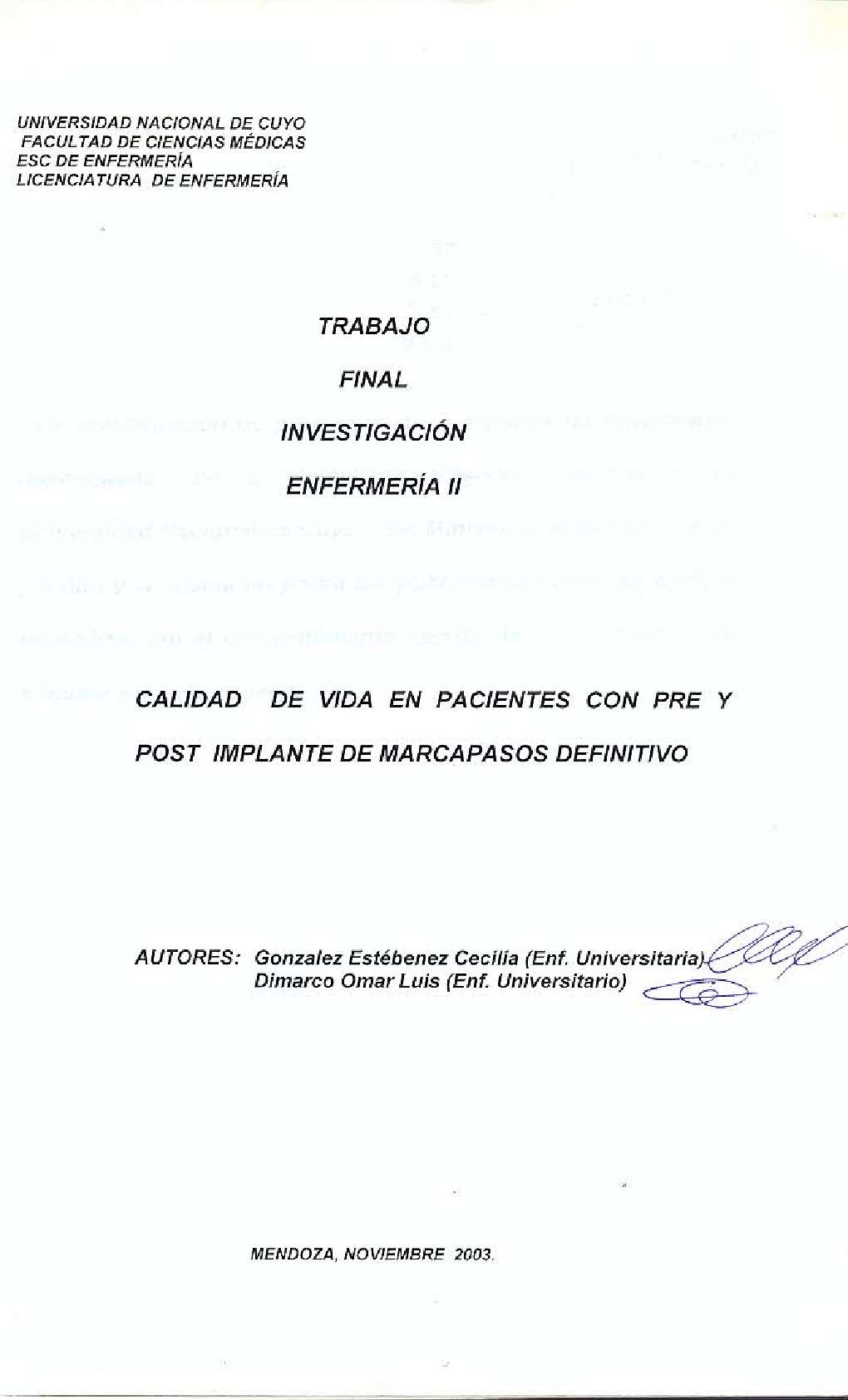 CALIDAD DE VIDA - PRÓTESIS E IMPLANTES - CUIDADOS PREOPERATORIOS - CUIDADOS POSTOPERATORIOS - ATENCIÓN DE ENFERMERÍA - FACTORES DE RIESGO - HOSPITAL ITALIANO DE MENDOZA (MENDOZA, ARGENTINA) - ROL DE LA ENFERMERA - ROL PROFESIONAL - MARCAPASO ARTIFICIAL