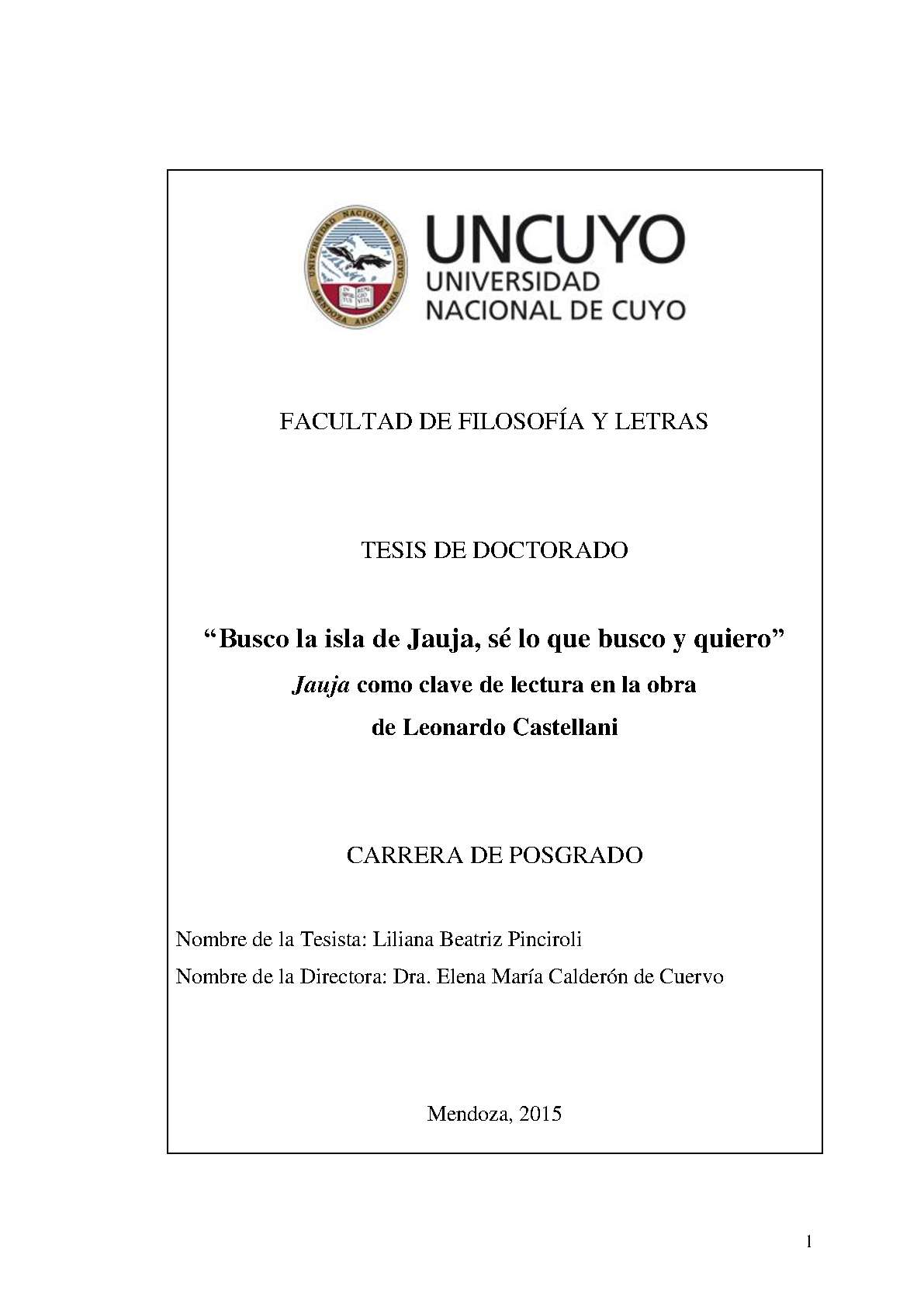 Pinciroli, Liliana Beatriz. (2015). "Busco la isla de Jauja, sé lo que busco y quiero": Jauja como clave de lectura en la obra : de Leonardo Castellani (Tesis de Doctorado). Mendoza, Universidad Nacional de Cuyo. Facultad de Filosofía y Letras .