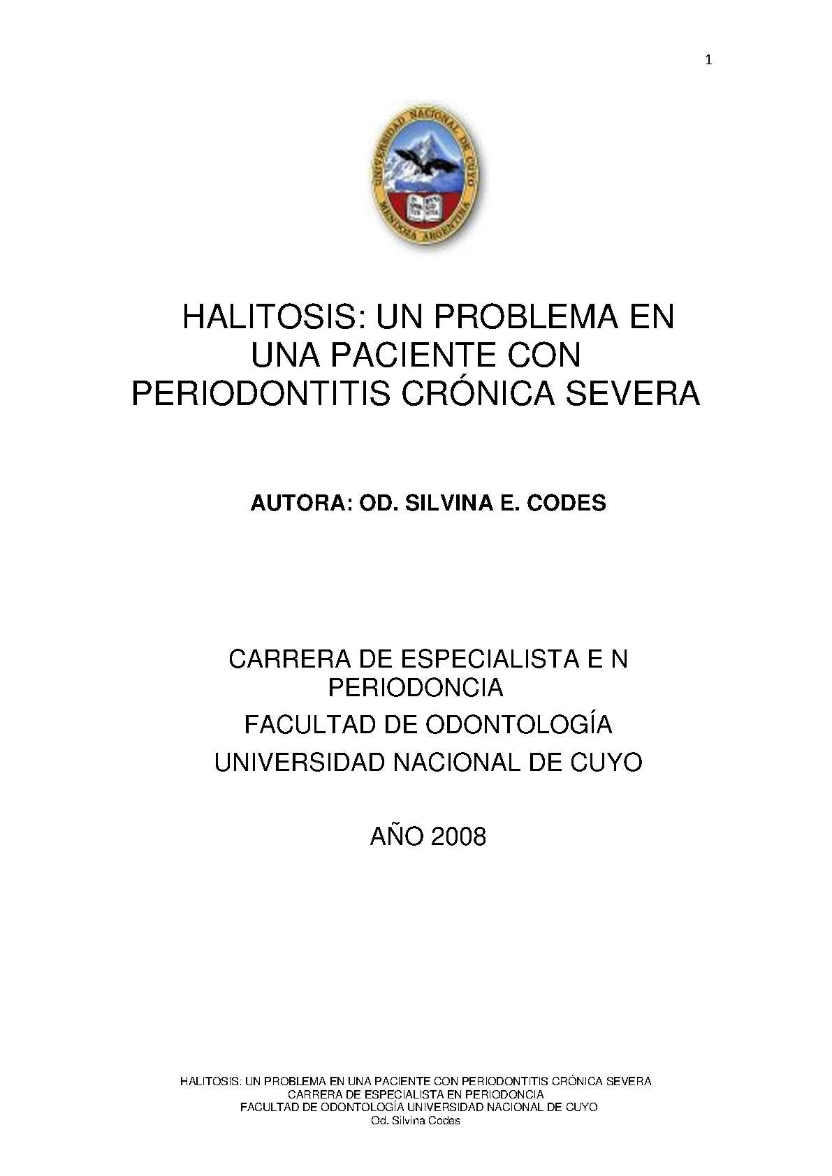 Codes, Silvina E.. (2008). Halitosis: un problema en una paciente con periodontitis crónica severa (Trabajo final de especialización). Mendoza, Universidad Nacional de Cuyo. Facultad de Odontología .