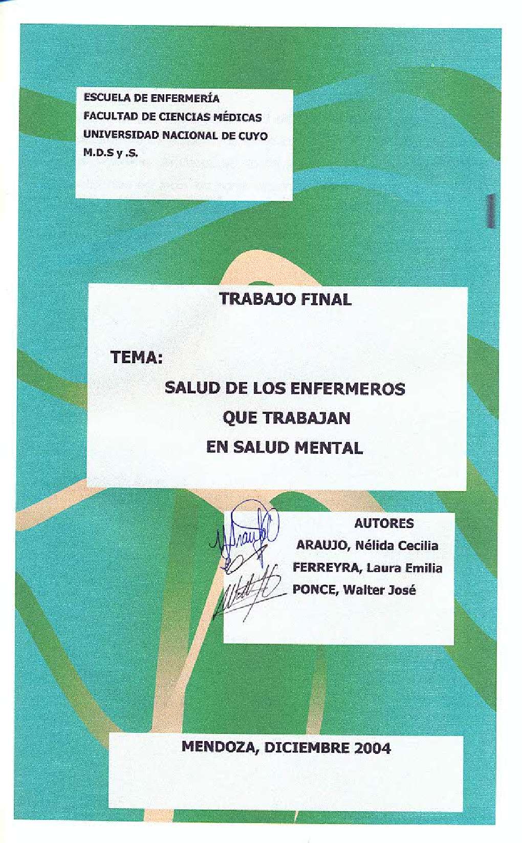 Se observa en los enfermeros que trabajan en el hospital de salud mental Dr. Carlos Pereyra, de la provincia de Mendoza, Argentina, signos y síntomas de estrés y patologías somáticas que podrían ser producidas por la creciente demanda de pacientes. Hay una falta de legislación que proteja la salud mental del personal de enfermería, lo que lleva a que se vea afectada no solo su salud mental sino que también su salud física y social. Esto se evitaría si se identificaran precozmente los posibles factores potenciales de riesgo. Este trabajo de investigación tiene como objetivo determinar cómo consideran afectada su salud psicofísica los enfermeros que se desempeñan en salud mental de dicho hospital, en el año 2003.