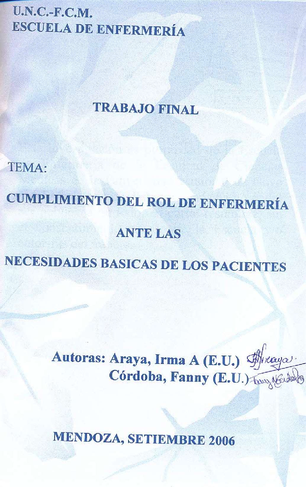 Araya, Irma A; Córdoba, Fanny. (2006). Cumplimiento del rol de enfermería ante las necesidades básicas de los pacientes: (Tesina de grado). Mendoza, Universidad Nacional de Cuyo. Facultad de Ciencias Médicas. Escuela de Enfermería..