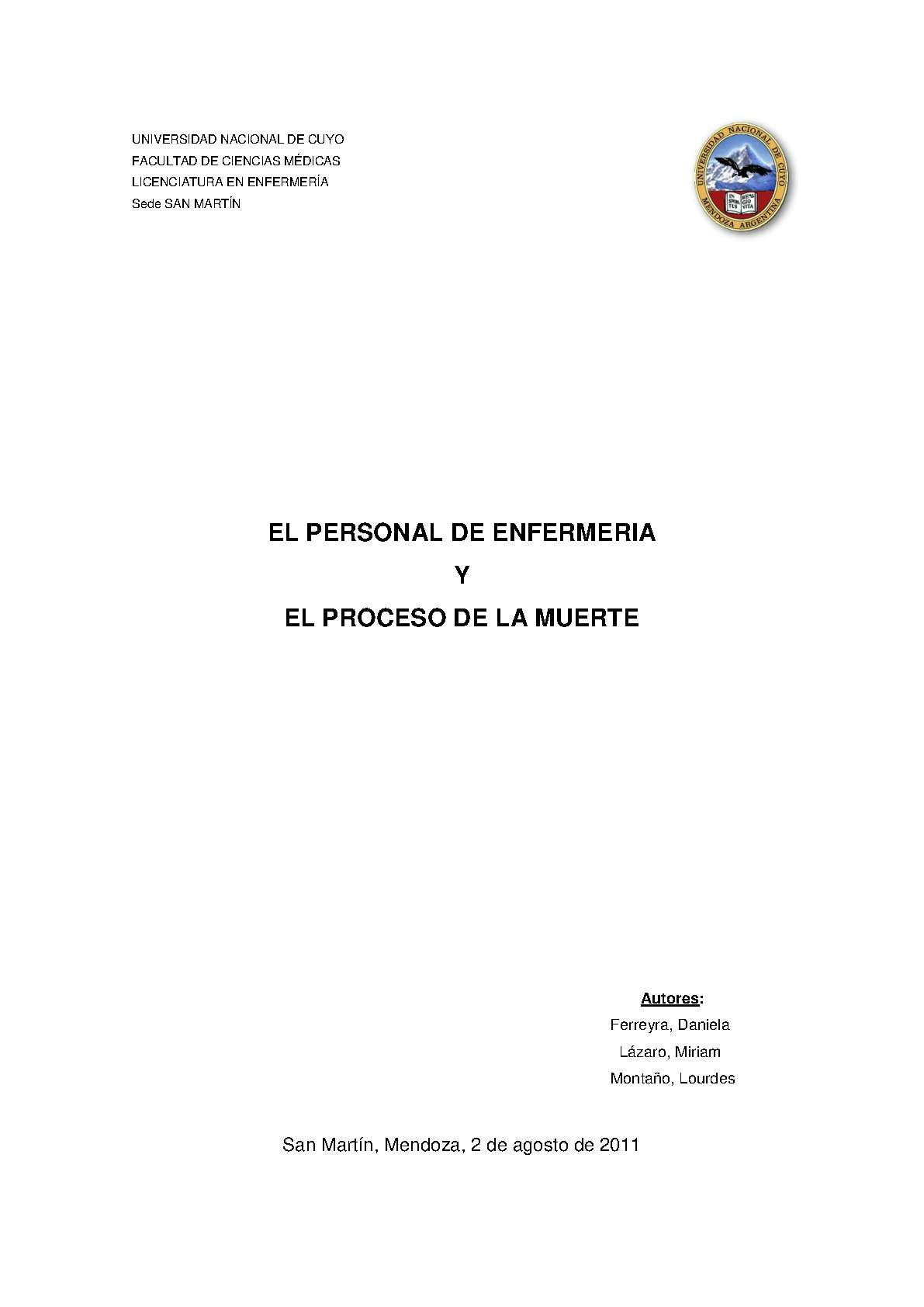 En la actualidad los profesionales de enfermería son quienes permanecen en contacto continuo con el paciente y su familia tanto en el nacimiento como al final de la vida, ya que la mayoría de ambos acontecimientos se producen en las instituciones de salud, esto hace que se generen relaciones entre el personal de salud, los pacientes y sus familiares. En muchos casos la duración de la internación del paciente se crea un vínculo estrecho que, en caso del fallecimiento, afecta la sensibilidad de los enfermeros, lo que con el tiempo puede desencadenar en un sentimiento de aceptación o rechazo hacia la muerte que se manifiestan en distintas actitudes personales. La muerte es la consecuencia de la vida y las personas “conviven" con el miedo a la muerte, pero posponen plantearse los problemas que les resultan angustiosos defendiéndose así de la ansiedad que les crea. Los profesionales de enfermería estan continuamente enfrentados a la muerte de otras personas. Esta confrontación puede resultar dolorosa o difícil, pero debe encontrar una actitud serena y equilibrada para aliviar sus sentimientos de tensión y cubrir al mismo tiempo las necesidades del paciente. Este trabajo de investigación tiene como objetivos conocer cómo afecta el proceso de la muerte al personal de enfermería de los servicios de cuidados críticos del Hospital Central (Terapia Intensiva, Unidad Coronaria, Aislamiento y Recuperación de Cirugía Cardiovascular) entre marzo y mayo del 2011.