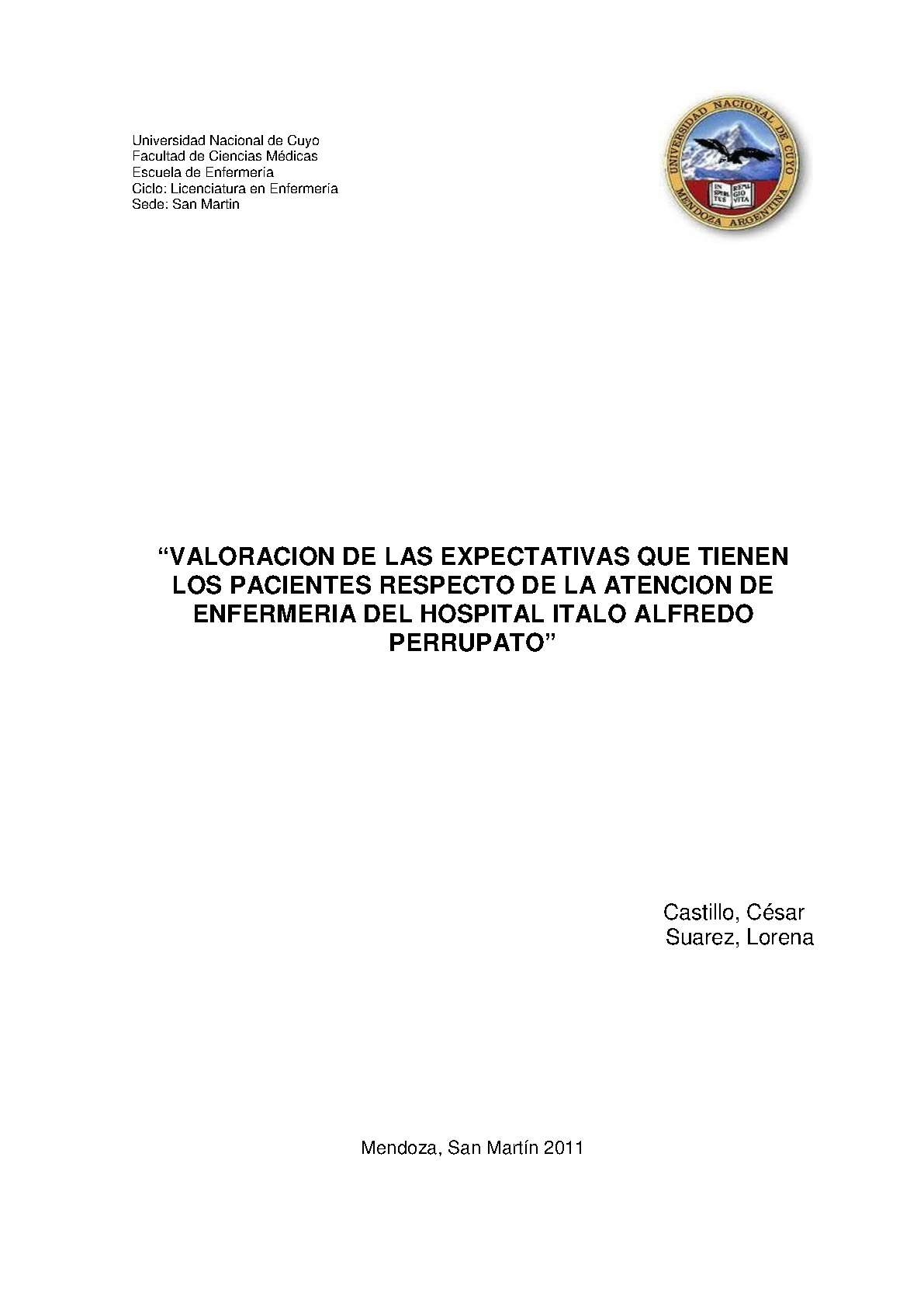 Dentro del equipo de salud, el personal de enfermería mantiene el vínculo más estrecho con los pacientes y su interrelación con todos los subsistemas de las unidades de atención, se sabe que las buenas relaciones interpersonales contribuyen en forma efectiva a la mejora de los servicios de salud y por consiguiente favorecer la relación enfermero/paciente. De nada sirve la ciencia y la tecnología si no es aplicada a partir de una relación de confianza y credibilidad, mediante el respeto, la confidencialidad, la cortesía y la comprensión de las diferentes situaciones que pueden presentar los pacientes. La valoración del paciente tiene una gran importancia para conocer respuesta a procesos vitales o problemas de salud, reales o potenciales, que puedan ser tratados por los enfermeros continuamente. Las expectativas de los pacientes deberían estar ligadas a ocho conceptos básicos que forman parte del personal de enfermería, quienes brindan la atención directa al mismo: Comunicación, cortesía, seguridad, credibilidad, conocimiento y comprensión de las necesidades, profesionalidad, capacidad de respuesta, accesibilidad. Estos aspectos pueden modificar las expectativas y opiniones que tienen los pacientes respecto de la atención de Enfermería. Este trabajo tiene como objetivo indagar y conocer qué opinión y expectativas tienen los pacientes internados en los servicios abiertos de Clínica Médica, Cirugía, Traumatología y Maternidad durante el mes de marzo de 2011, sobre la atención de los profesionales de enfermería del Hospital Ítalo Alfredo Perrupato del departamento de San Martín, Mendoza.