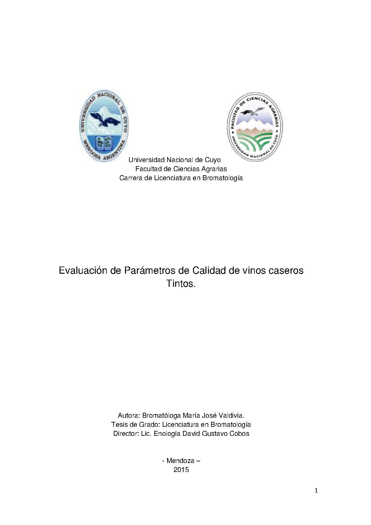 Valdivia, María José. (2017). Evaluación de parámetros de calidad de vinos caseros tintos: (Tesina de grado). Mendoza, Universidad Nacional de Cuyo. Facultad de Ciencias Agrarias .