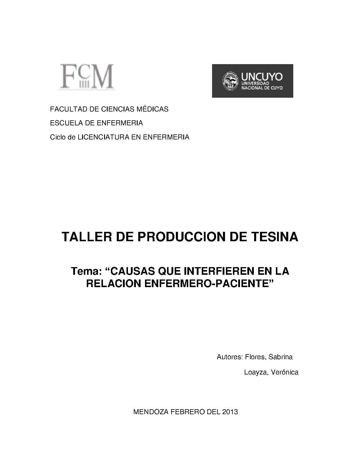 Flores, Sabrina; Loayza, Verónica. (2013). Causas que infieren en la relación enfermero-paciente: (Tesina de grado). Mendoza, Universidad Nacional de Cuyo. Facultad de Ciencias Médicas. Escuela de Enfermería..