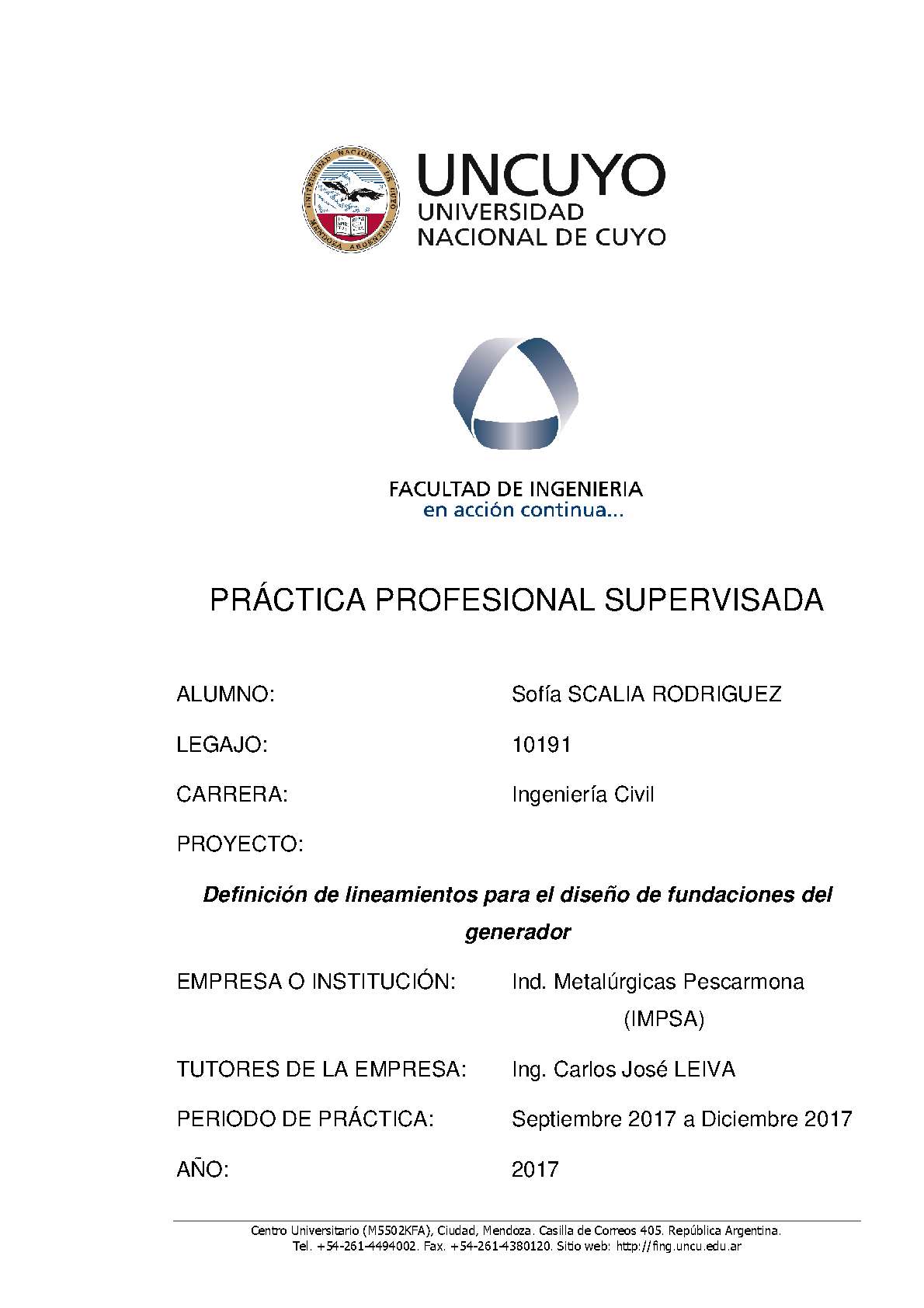 La práctica se realizó, en su totalidad, en la empresa "Industrias Metalúrgicas Pescarmona (IMPSA)" entre los meses de septiembre y diciembre del año 2017, acumulando un total de 300 horas. El proyecto realizado fue la "Definición de lineamientos para el diseño de fundaciones del generador".