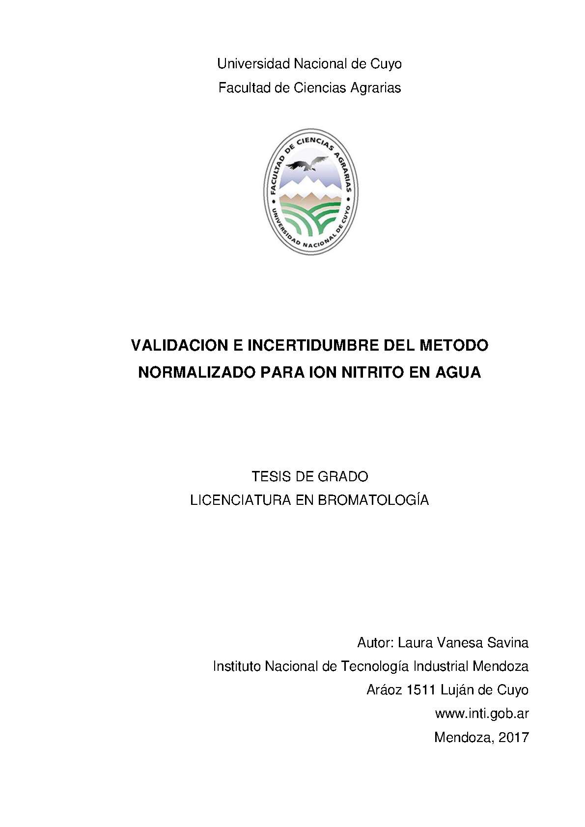 Savina, Laura Vanesa. (2017). Validación e incertidumbre del método normalizado para ion nitrito en agua: (Tesina de grado). Mendoza, Universidad Nacional de Cuyo. Facultad de Ciencias Agrarias .