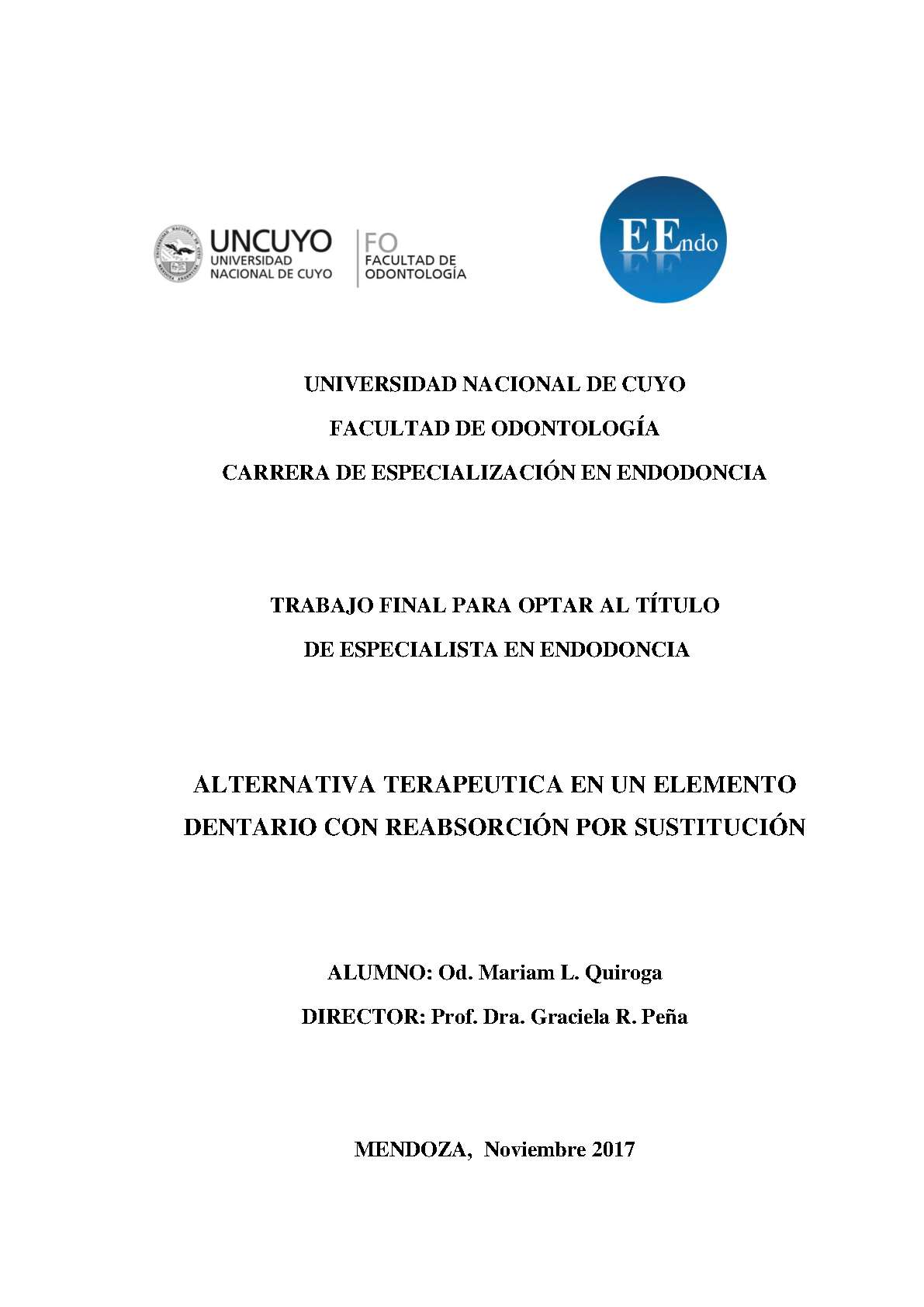 Quiroga, Mariam Leticia. (2017). Alternativa terapéutica en un elemento dentario con reabsorción por sustitución: (Trabajo final de especialización). Mendoza, Universidad Nacional de Cuyo. Facultad de Odontología .