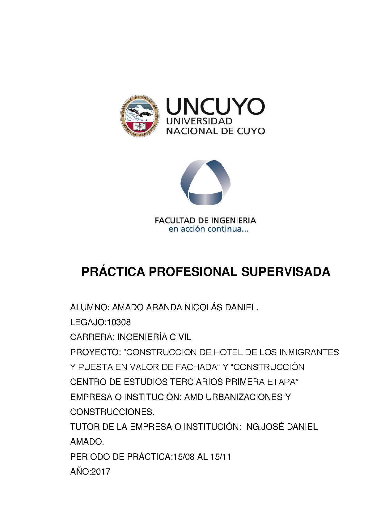 En el presente informe, se presenta el desarrollo de los distintos trabajos realizados en el marco de las Prácticas Profesionales Supervisadas, llevadas a cabo en la empresa “AMD Urbanizaciones y Construcciones".