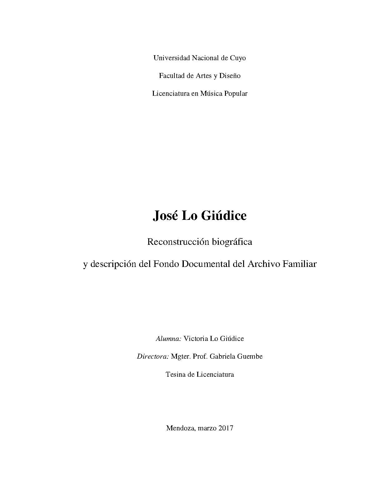 La presente tesina de licenciatura se centra en la figura del compositor argentino José Lo Giúdice (1900-1971), y se propone como objetivos principales revalorizar su figura, su producción y su accionar como gestor cultural.