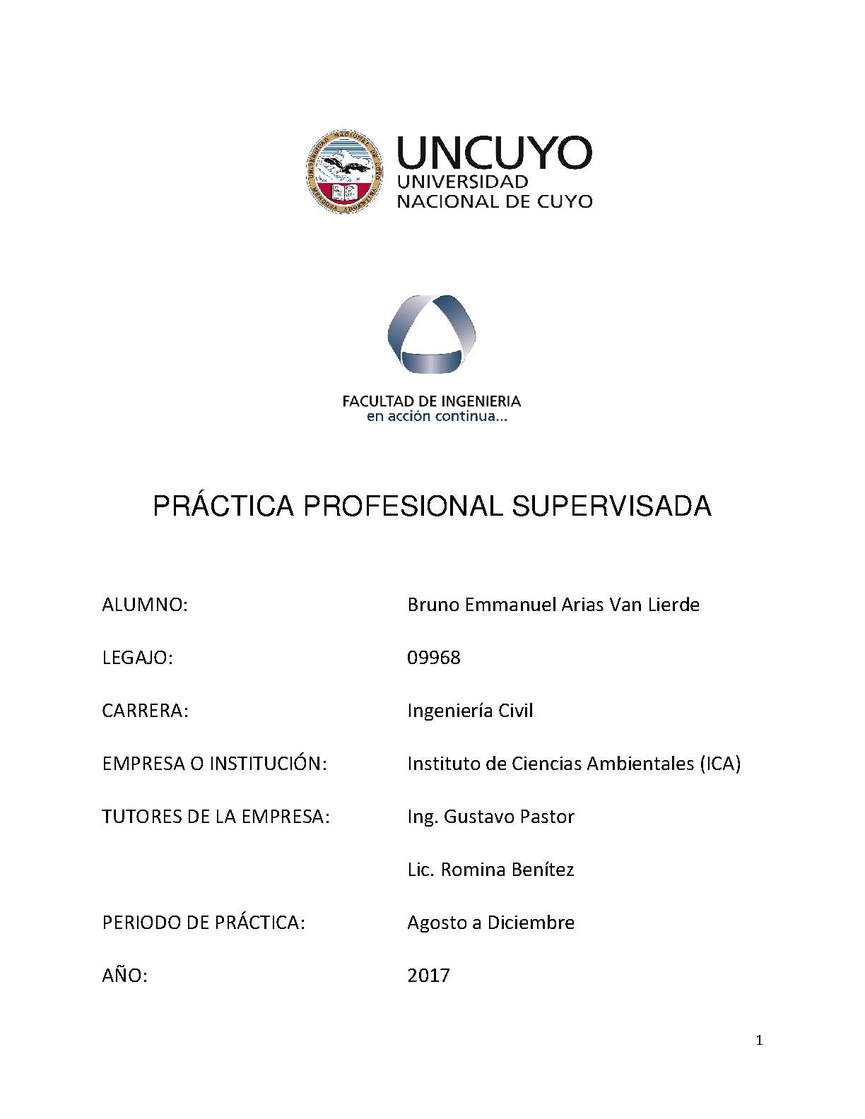 La experiencia laboral, fue llevada a cabo en el Instituto de Ciencias Ambientales (ICA), dependiente de la Secretaría de Desarrollo Institucional y Territorial de la Universidad Nacional de Cuyo, durante el período comprendido entre los meses de Agosto y Diciembre de 2017.
