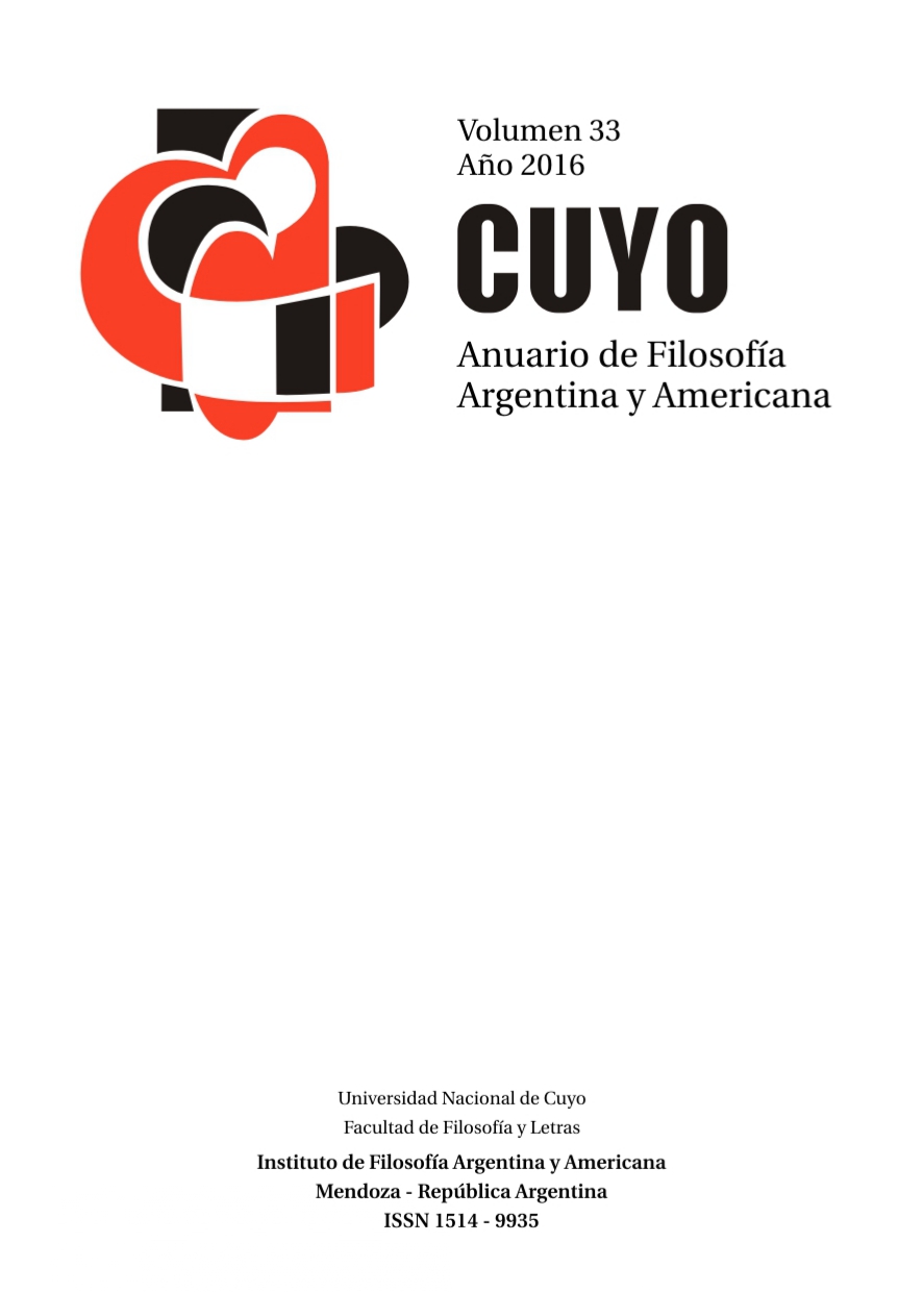 CUYO is a yearly publication of the Institute of Argentine and American Philosophy (the American Continent as a whole) of the Faculty of Philosophy and Literature of the National University of Cuyo (Mendoza, Argentina). This publication contains research papers on Philosophy, History of Argentine and American Philosophy, History of American Ideas, and related disciplines. In its “Texts” section, it recovers for publication unpublished writings and ancient works and documents. Since 1965, CUYO has provided a space for the exchange of opinions and critical analysis with a scientifc note, addressed not only to the specialized reader but also to the general public. This publication is included in: Handbook of Latin American Studies of the Library of Congress, EE.UU.; Directory of Social Sciences; International Directory of Philosophy and Philosophers; Latindex; Dialnet; Harvard Library Bibliographic Dataset; Bdigital–UNCuyo; Nucleo Básico de Revistas Científcas Argentinas, CAICYT/CONICET; and Scientifc Library On line–SciELO. Every opinion expressed here by the authors is their own responsibility.