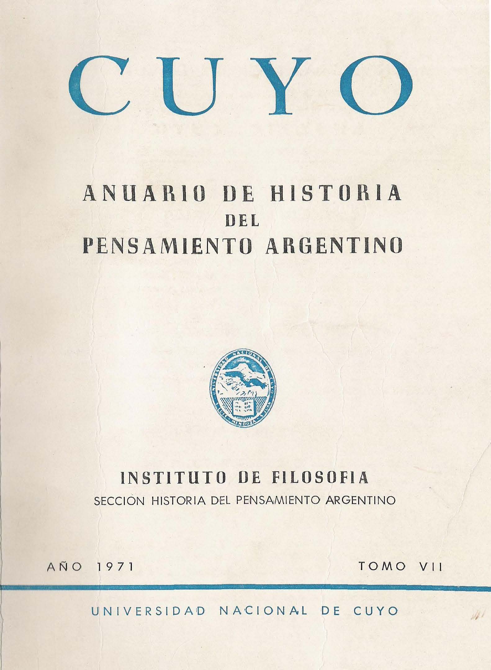 CUYO es una publicación anual del Instituto de Filosofía Argentina y Americana de la Facultad de Filosofía y Letras de la Universidad Nacional de Cuyo (Mendoza, Argentina). Difunde trabajos de investigación sobre Filosofía, Historia de la Filosofía Argentina y Americana, Historia de las Ideas Americanas y disciplinas afines. En su sección “Textos” rescata inéditos, escritos antiguos y documentación. Desde 1965 es un espacio de diálogo y análisis crítico con calidad científica y rigor académico, dirigida a un lector especializado, pero también a un público en general. Esta revista está incluida en el Handbook of Latin American Studies de la Library of Congress, EEUU, en el Directory of Social Sciences y en el Latindex. Las opiniones expresadas por los autores son de su exclusiva responsabilidad. CUYO is a yearly publication of the Institute of Argentine and American Philosophy (the American Continent as a whole) of the Faculty of Philosophy and Literature of Cuyo University (Mendoza, Argentina). This publication contains research papers on Philosophy, History of Argentine and American Philosophy, History of American Ideas, and related disciplines. In its “Texts” section, it recovers for publication unpublished writings and ancient works and documents. Since 1965, CUYO has provided a space for the exchange of opinions and critical analysis with a scientific note, addressed not only to the specialized reader but also to the general public. This publication is included in the Handbook of Latin American Studies of the Library of Congress, in the Directory of Social Sciences and in the Latindex. Every opinion expressed here by the authors is their own responsibility.