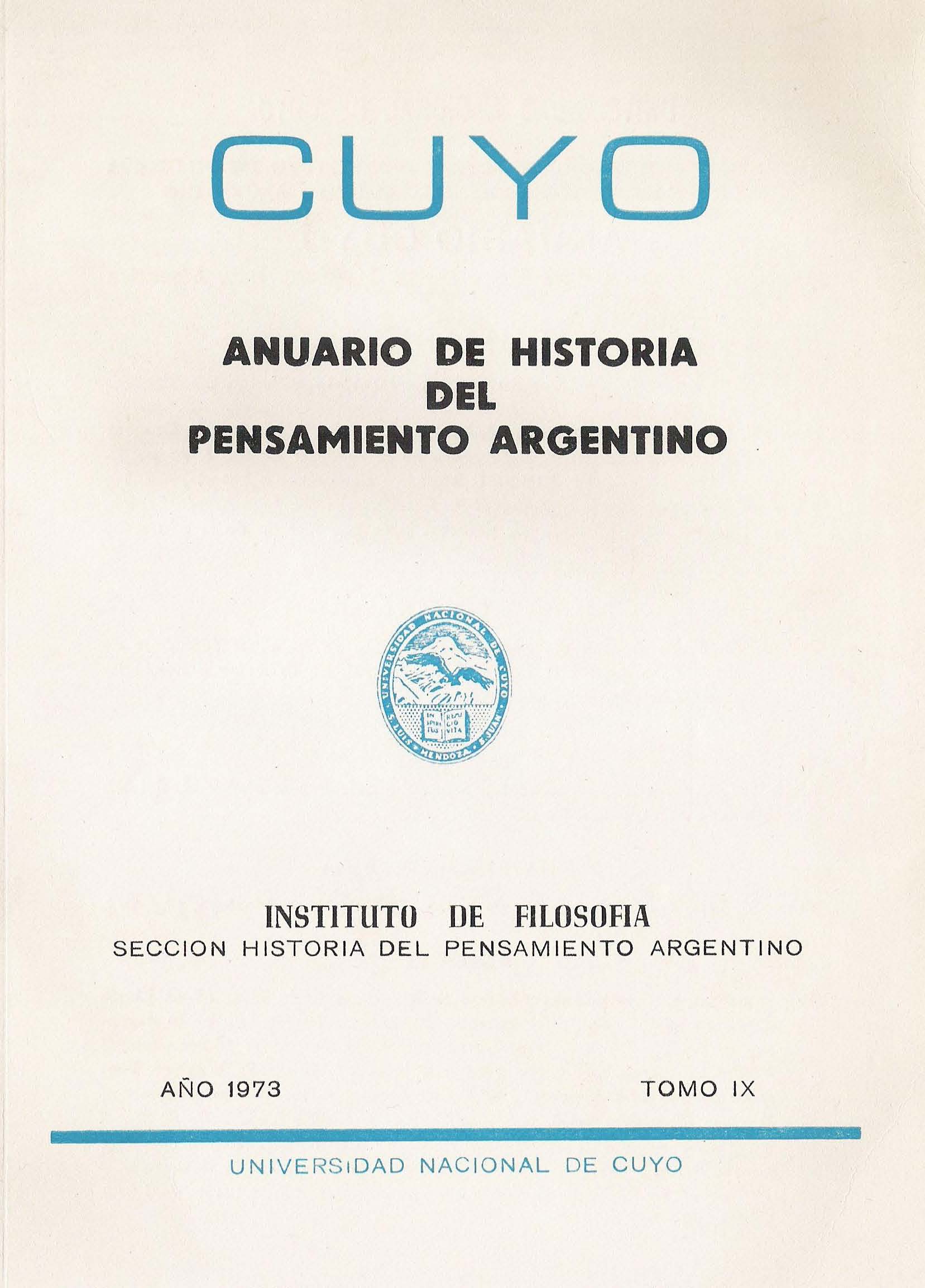 CUYO es una publicación anual del Instituto de Filosofía Argentina y Americana de la Facultad de Filosofía y Letras de la Universidad Nacional de Cuyo (Mendoza, Argentina). Difunde trabajos de investigación sobre Filosofía, Historia de la Filosofía Argentina y Americana, Historia de las Ideas Americanas y disciplinas afines. En su sección “Textos” rescata inéditos, escritos antiguos y documentación. Desde 1965 es un espacio de diálogo y análisis crítico con calidad científica y rigor académico, dirigida a un lector especializado, pero también a un público en general. Esta revista está incluida en el Handbook of Latin American Studies de la Library of Congress, EEUU, en el Directory of Social Sciences y en el Latindex. Las opiniones expresadas por los autores son de su exclusiva responsabilidad. CUYO is a yearly publication of the Institute of Argentine and American Philosophy (the American Continent as a whole) of the Faculty of Philosophy and Literature of Cuyo University (Mendoza, Argentina). This publication contains research papers on Philosophy, History of Argentine and American Philosophy, History of American Ideas, and related disciplines. In its “Texts” section, it recovers for publication unpublished writings and ancient works and documents. Since 1965, CUYO has provided a space for the exchange of opinions and critical analysis with a scientific note, addressed not only to the specialized reader but also to the general public. This publication is included in the Handbook of Latin American Studies of the Library of Congress, in the Directory of Social Sciences and in the Latindex. Every opinion expressed here by the authors is their own responsibility.