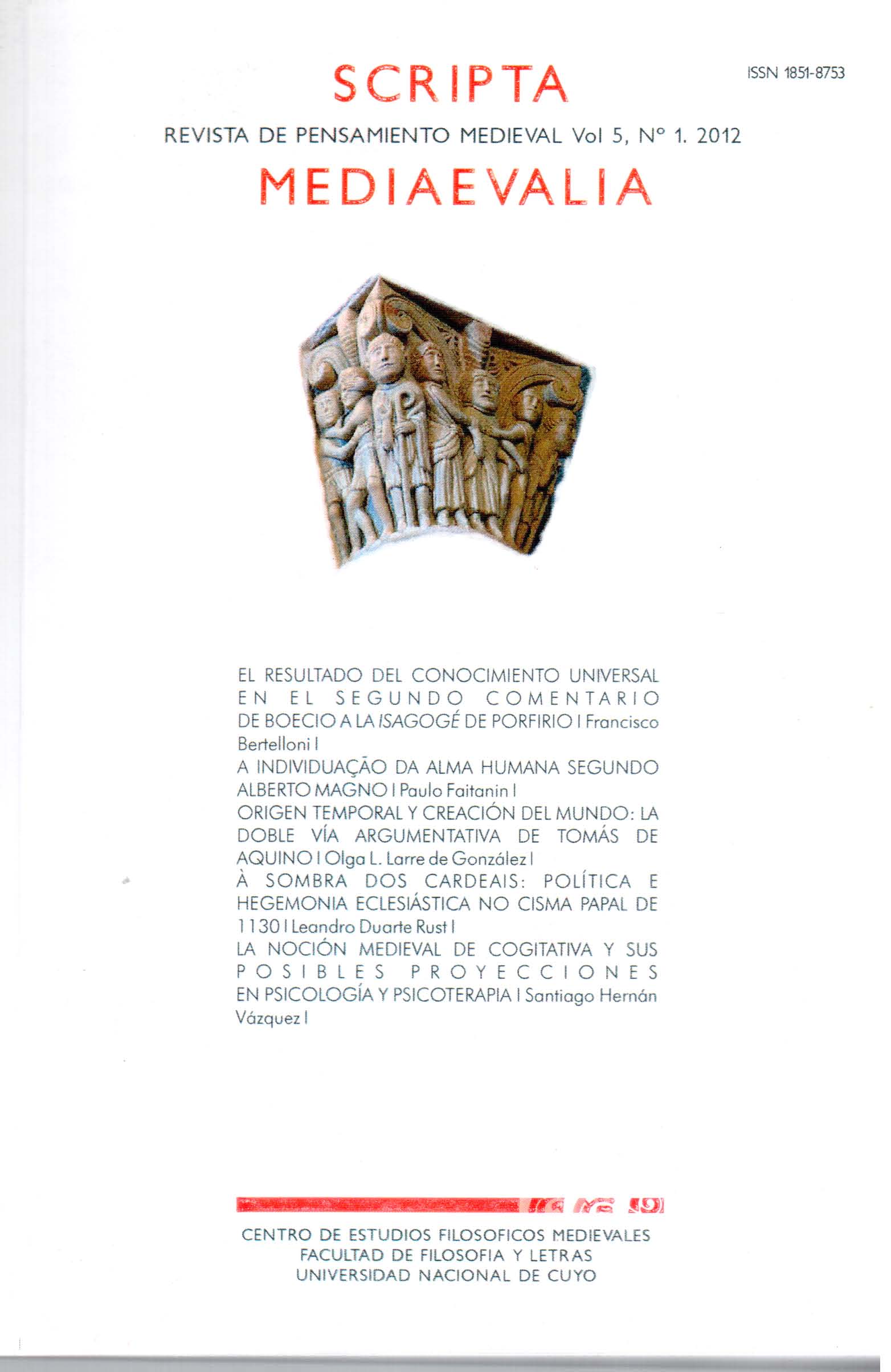 SCRIPTA MEDIAEVALIA nace como una publicación institucional del Centro de Estudios Filosóficos medievales dependiente del Instituto de Filosofía de la Facultad de Filosofía y Letras de la Universidad Nacional de Cuyo que fuera fundado en el año 2001, y que reúne a estudiosos del pensamiento y de la filosofía medieval pertenencientes a la UNCuyo y a otras universidades del país y del exterior. En él se han desarrollado proyectos de investigación que ha dado como resultado publicaciones en editoriales argentinas y del extranjero. Además se organizan encuentros científicos sobre temáticas medievales, particularmente las Jornadas Internacionales de Pensamiento Medieval, en las que participan anualmente, desde 2003, investigadores de la filosofía de la Edad Media de la Argentina, España y otros países iberoamericanos. SCRIPTA MEDIAEVALIA es reseñada e indexada en: International Medieval Bibliography, Repertorio de Medievalismo Hispánico y Medioevo Latino. Este volumen se publica gracias a un subsidio de la Secretaría de Ciencia y Técnica de la Universidad Nacional de Cuyo.
