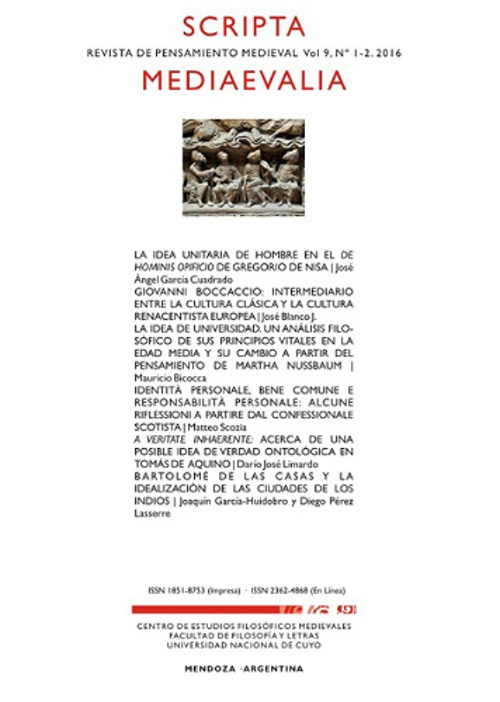 Scripta Medievalia es una publicación periódica, de frecuencia semestral, que reúne trabajos de investigación originales, textos e información sobre el pensamiento medieval. Scripta Medievalia integra el núcleo básico de publicaciones científicas argentinas y es reseñada e indexada en: International Medieval Bibliography, Repertorio de Medievalismo Hispánico, Medioevo Latino y Latindex. Scripta Medievalia integra el Repositorio Bibliográfico de la Universidad Nacional de Cuyo: http://bdigital.uncu.edu.ar/ Este volumen se publica gracias a un subsidio de la Secretaría de Ciencia y Técnica de la Universidad Nacional de Cuyo.