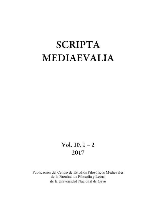 Scripta Medievalia es una publicación periódica, de frecuencia semestral, que reúne trabajos de investigación originales,textos e información sobre el pensamiento medieval. Scripta Medievalia integra el núcleo básico de publicaciones científicas argentinas y es reseñada e indexada en: International Medieval Bibliography, Repertorio de Medievalismo Hispánico, Medioevo Latino y Latindex. Scripta Medievalia integra el Repositorio Bibliográfico de la Universidad Nacional de Cuyo: http://bdigital.uncu.edu.ar/ Este volumen se publica gracias a un subsidio de la Secretaría de Ciencia y Técnica de la Universidad Nacional de Cuyo.
